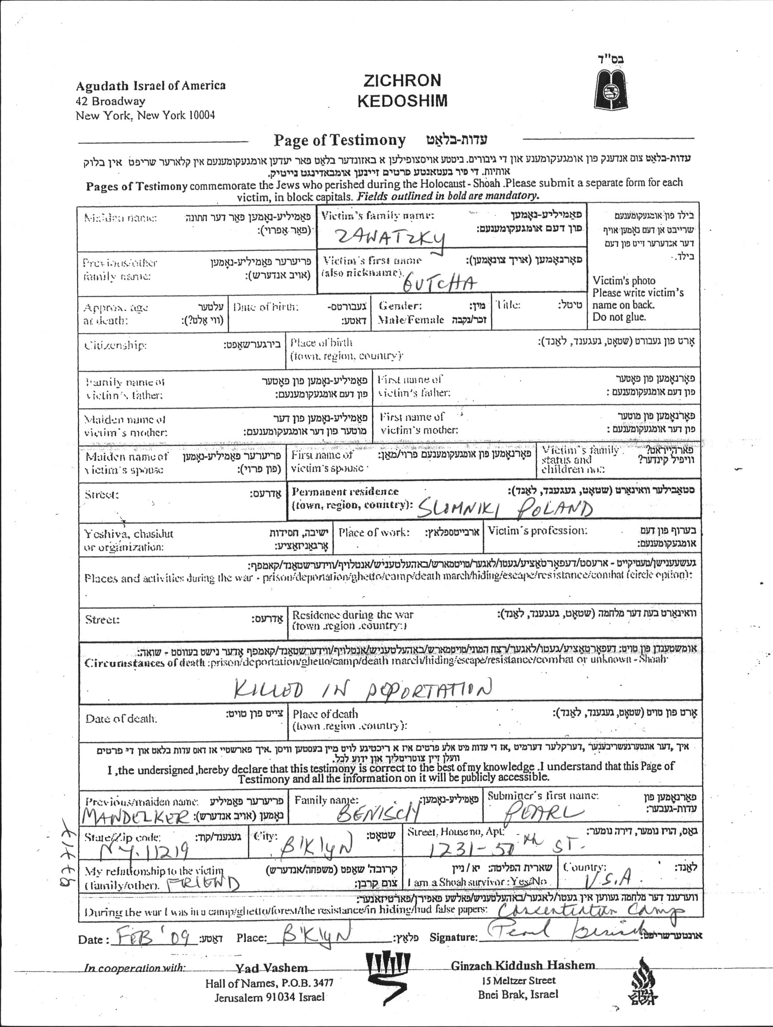 Zawatzky Gutcha Slomniki, Pologne Feuille de témoignage