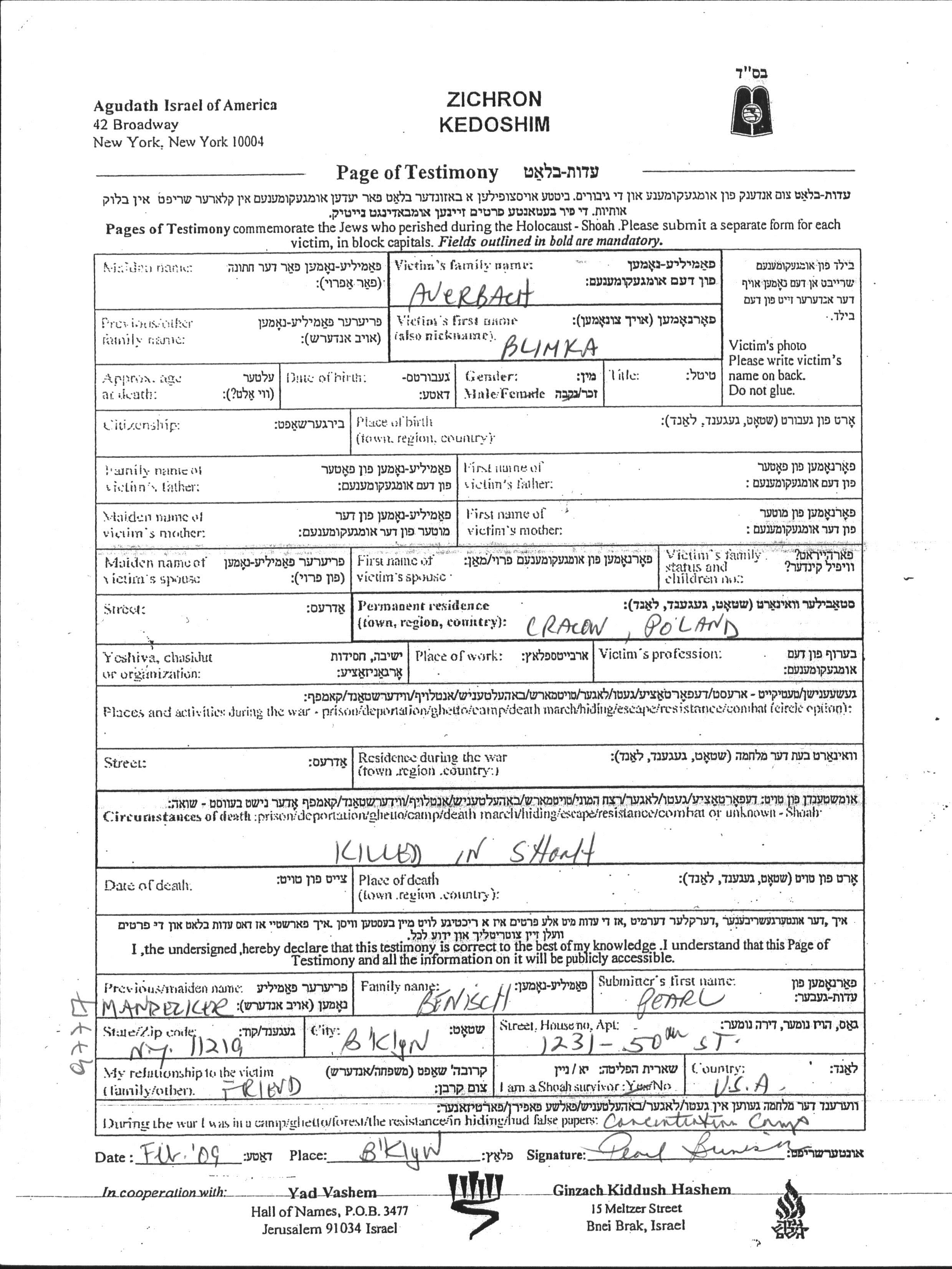 Auerbach Blimka Krakow, Pologne Feuille de témoignage