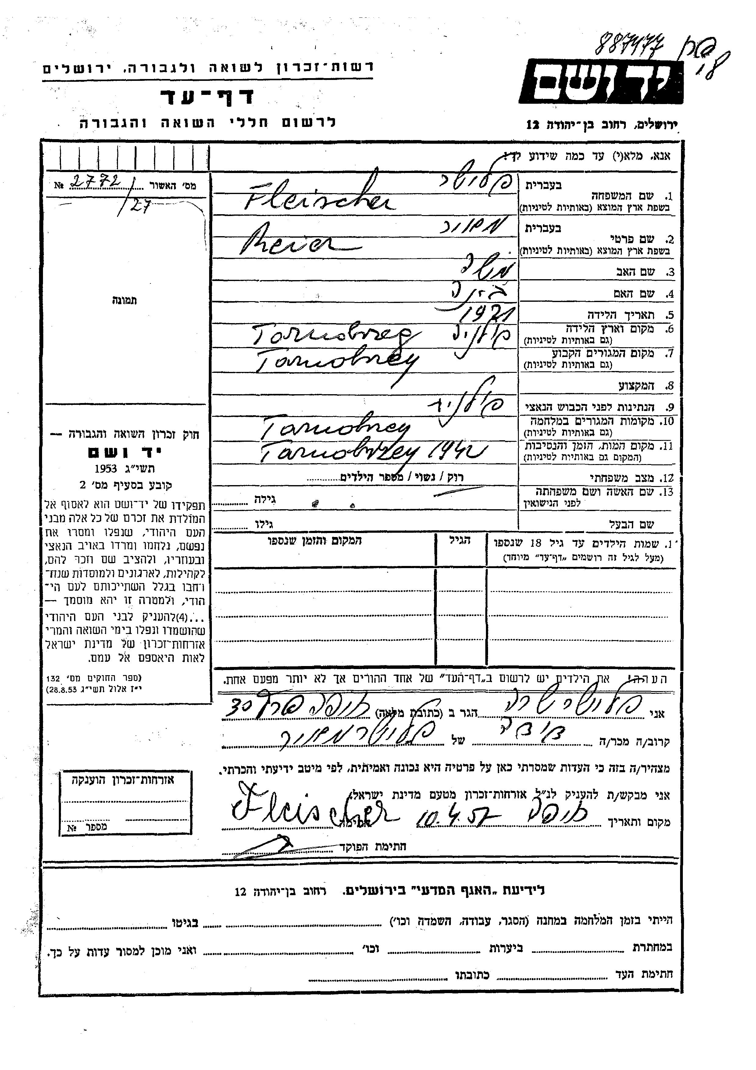 Fleischer Felisher Meir 1921 Tarnobrzeg, Pologne Feuille de témoignage