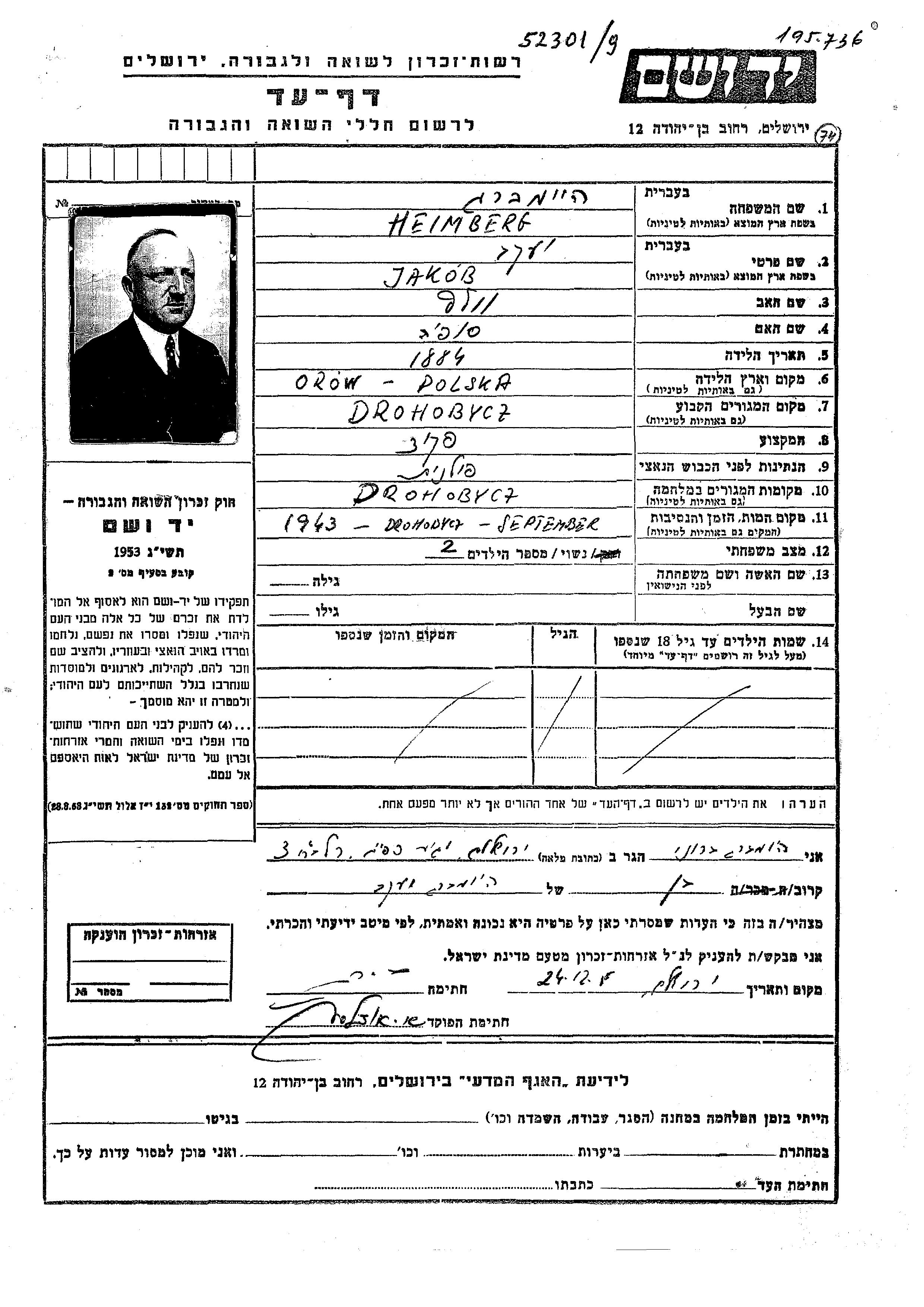 Heimberg Jakob 1884 Drohobycz, Pologne Feuille de témoignage