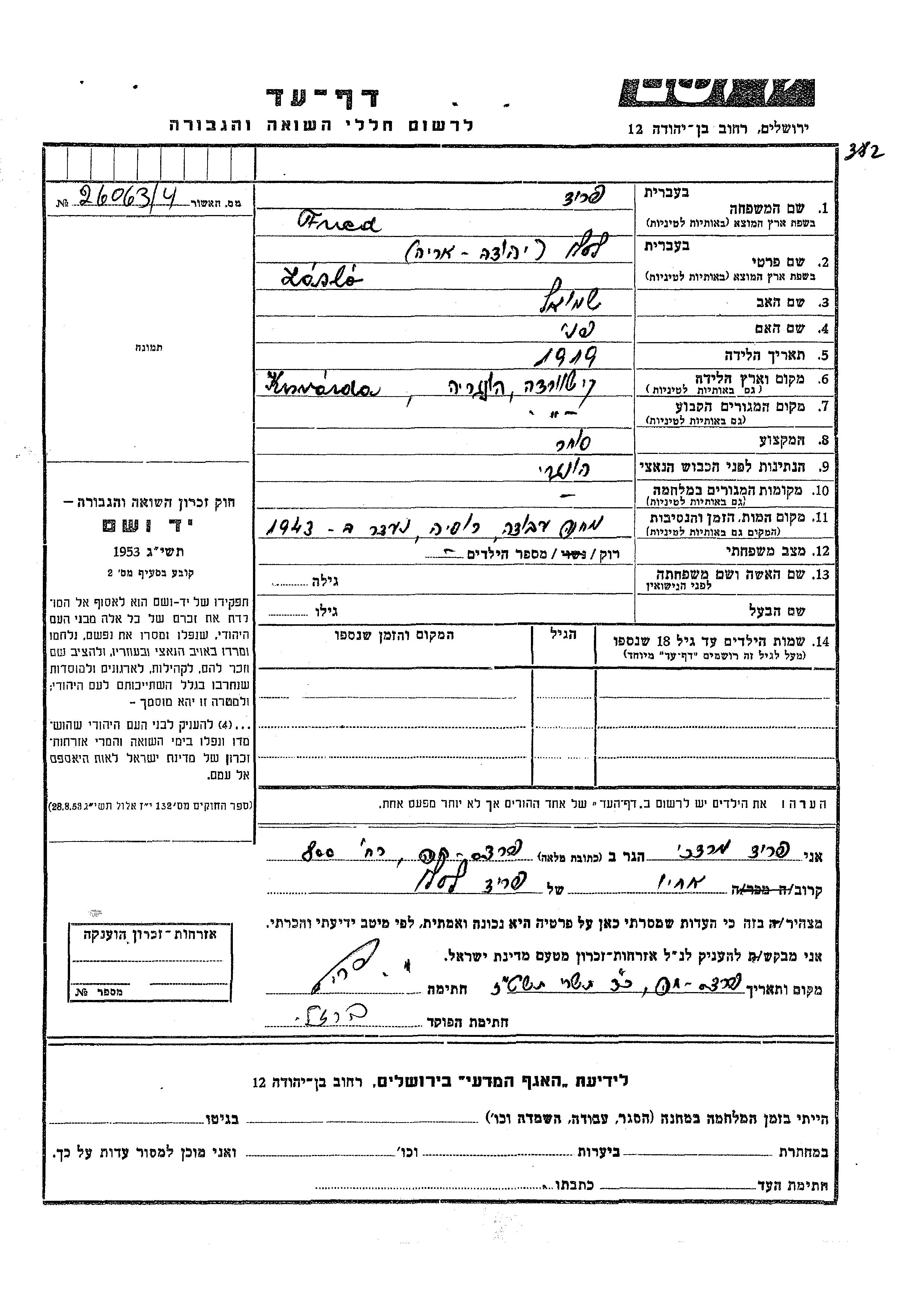 Freid Frid Laslo Yehuda Arie 1919 Kisvarda, Hongrie Feuille de témoignage