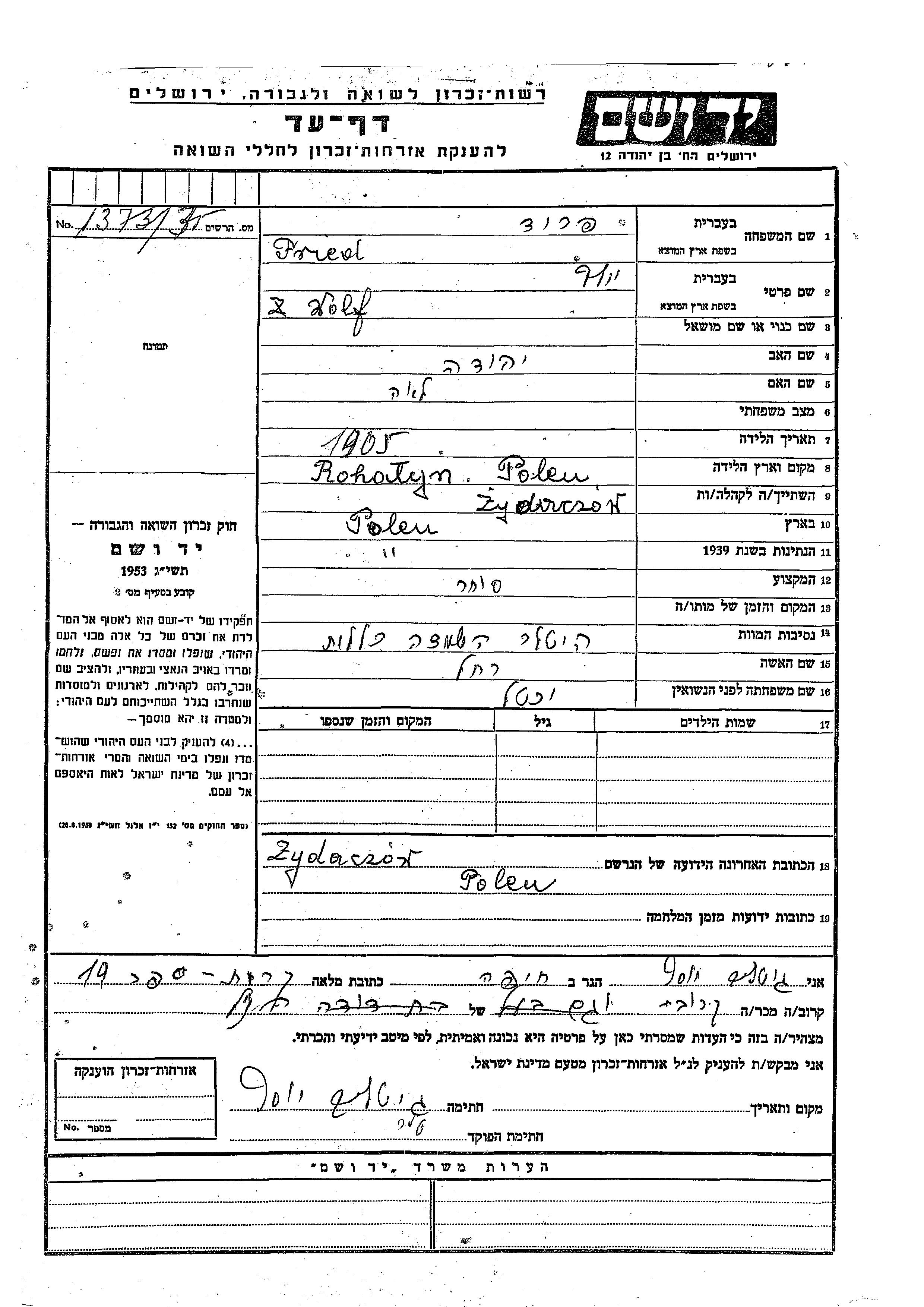 Wolf Fried est né à Rohatyn, Pologne en 1905, fils de Yehuda et de Lea. Il était Commerçant/e. Avant la seconde guerre mondiale il vivait à Zydaczow, Pologne.