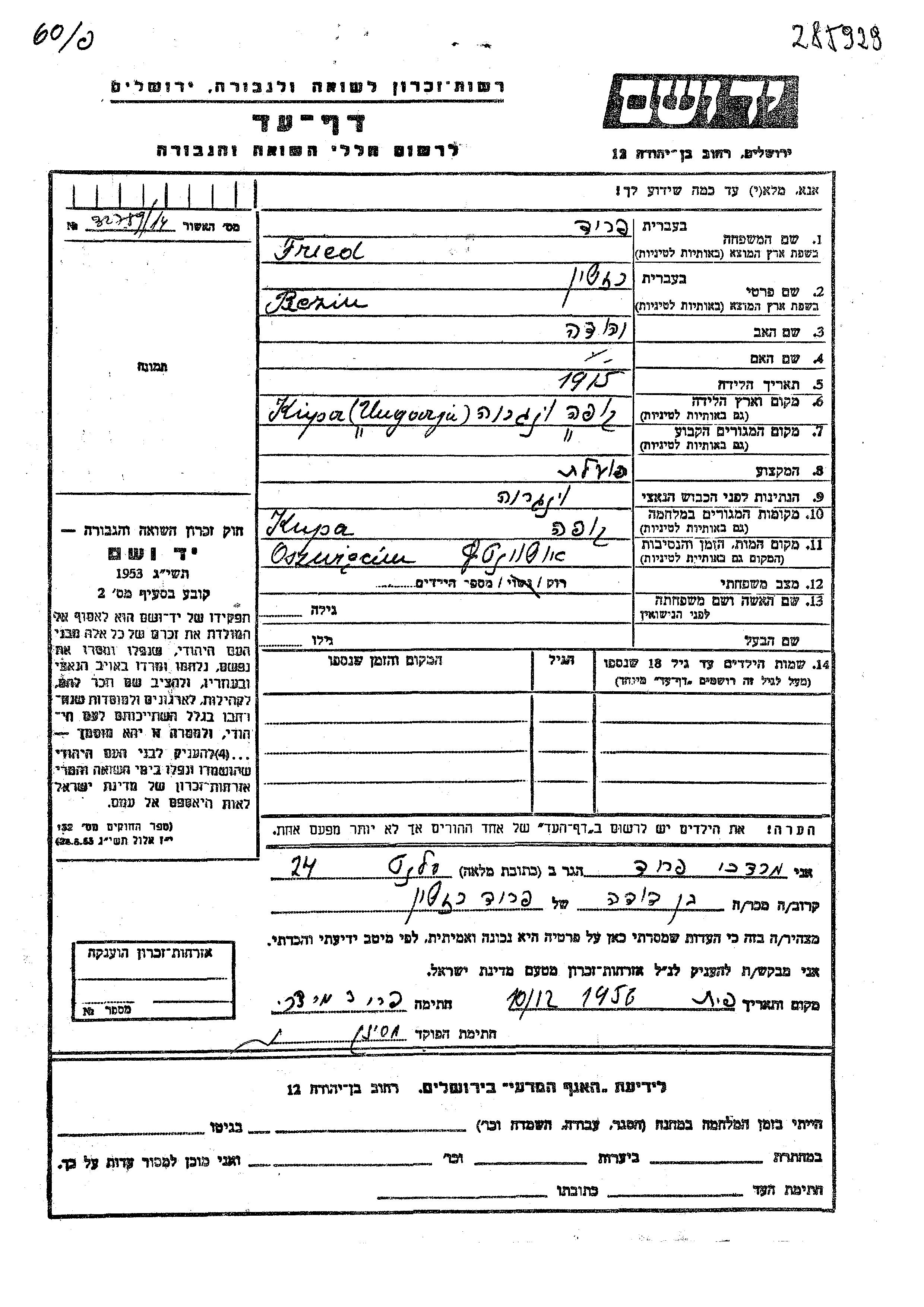 Rezhin Regina Fried est née à Kupa, Hongrie en 1915, fille de Yehuda. Elle était Ouvrier/e et Célibataire. Avant la seconde guerre mondiale elle vivait à Kupa, Hongrie. Pendant la guerre, elle était à Kupa, Hongrie.