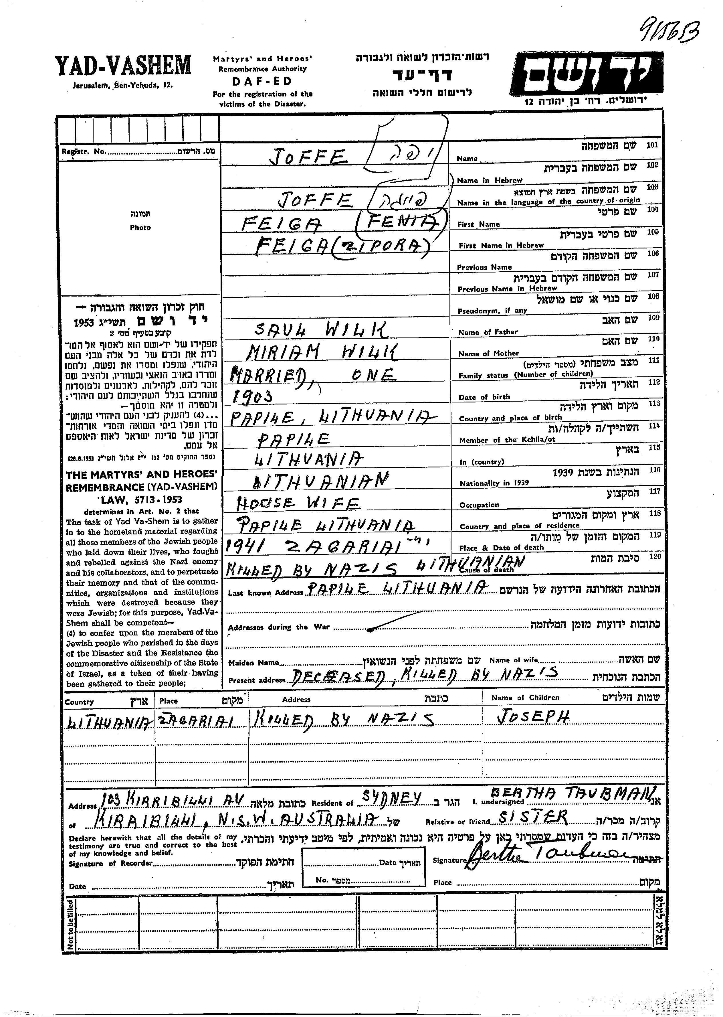 Fenia Zipora Feiga Joffe née Wilk est née à Papilė, Lituanie en 1903, fille de Saul et de Miriam. Elle était Femme au foyer et Mariée. Avant la seconde guerre mondiale elle vivait à Papilė, Lituanie. Pendant la guerre, elle était à Papilė, Lituanie.