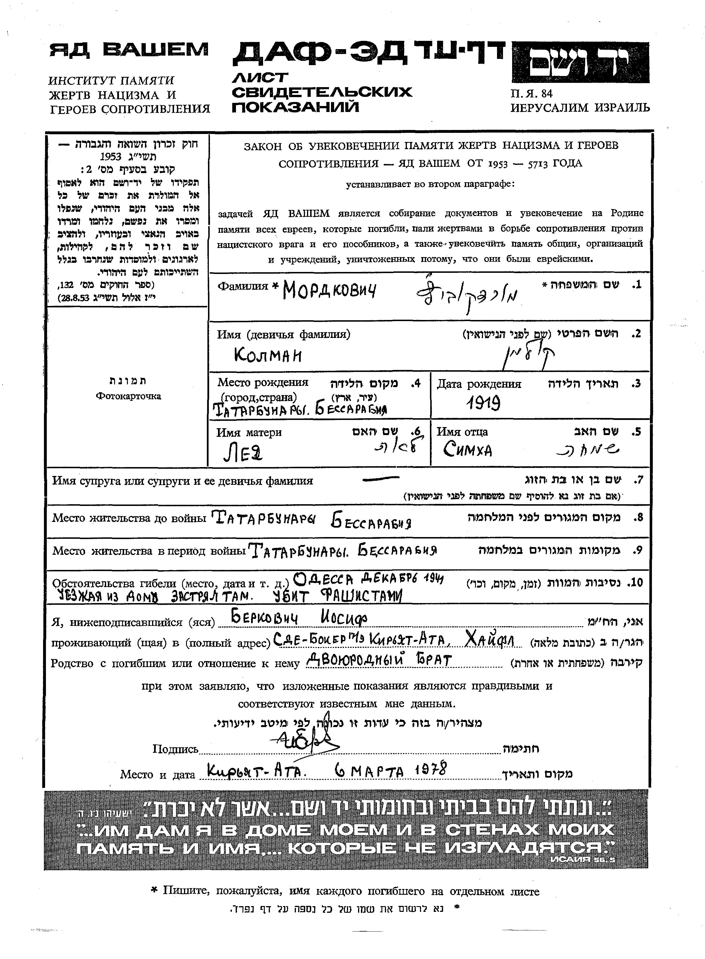 Mordkovich Kolman 1919 Tatarbunary, Roumanie Feuille de témoignage