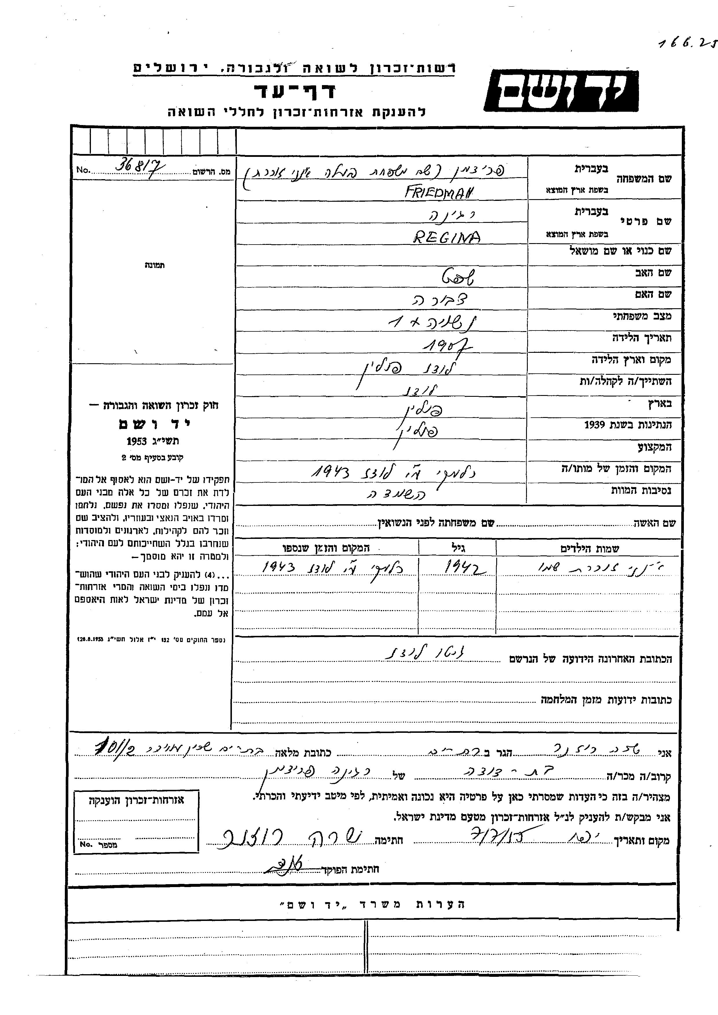 Friedman Regina 1907 endroit inconnu, Feuille de témoignage