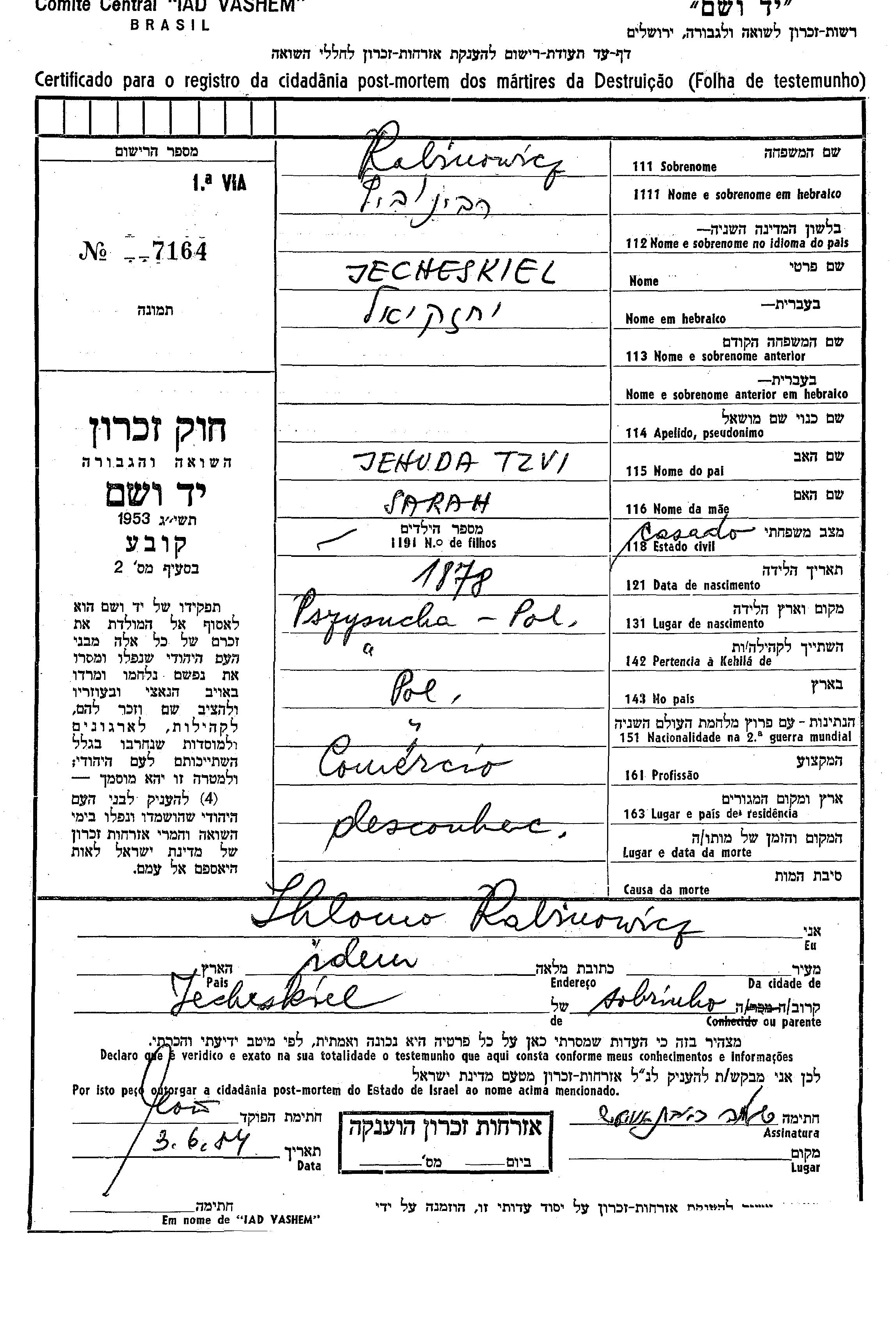 Rabinowicz Jecheskiel 1878 Pszysucha, Pologne Feuille de témoignage