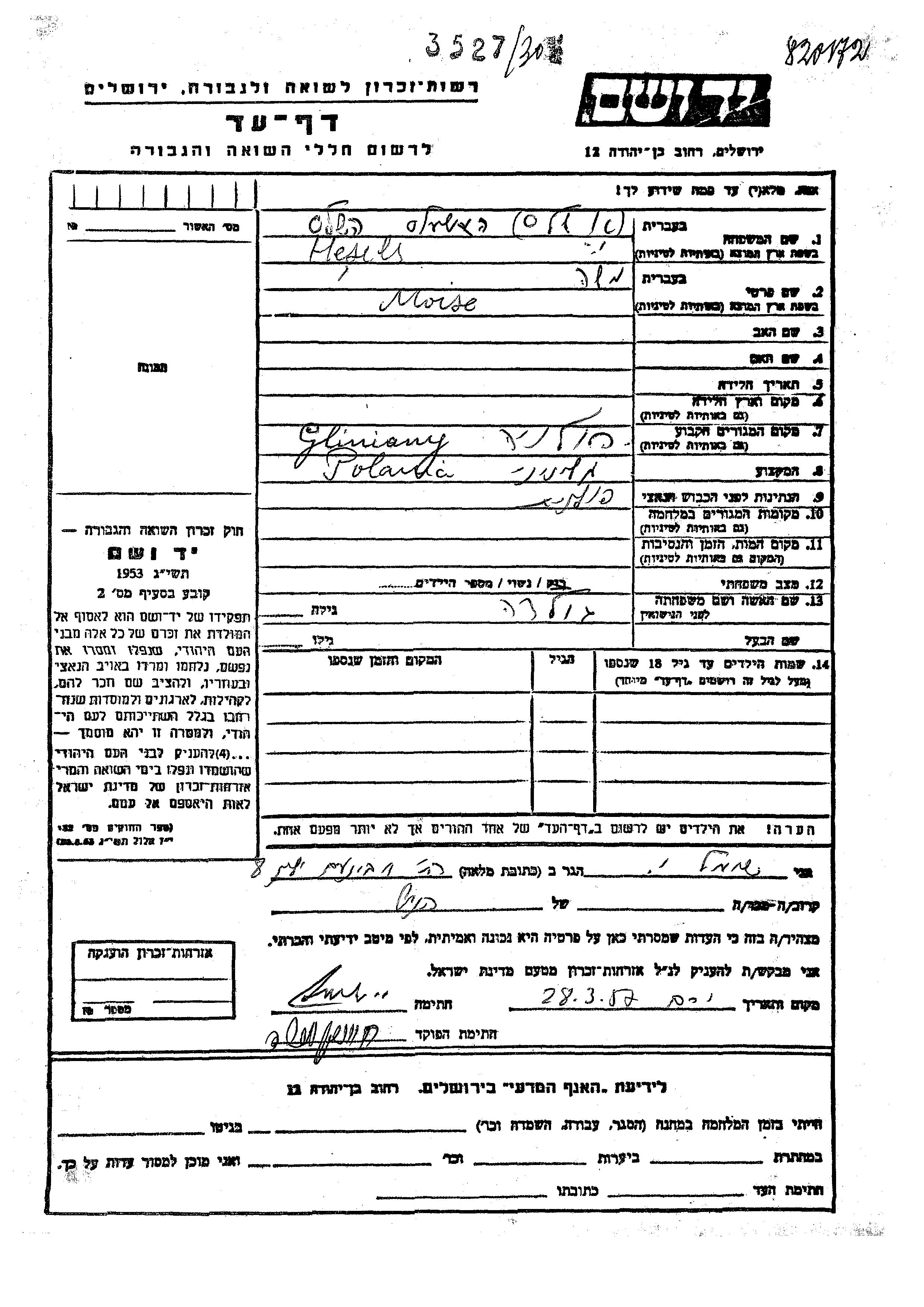 Hesheles Moise Gliniany, Pologne Feuille de témoignage