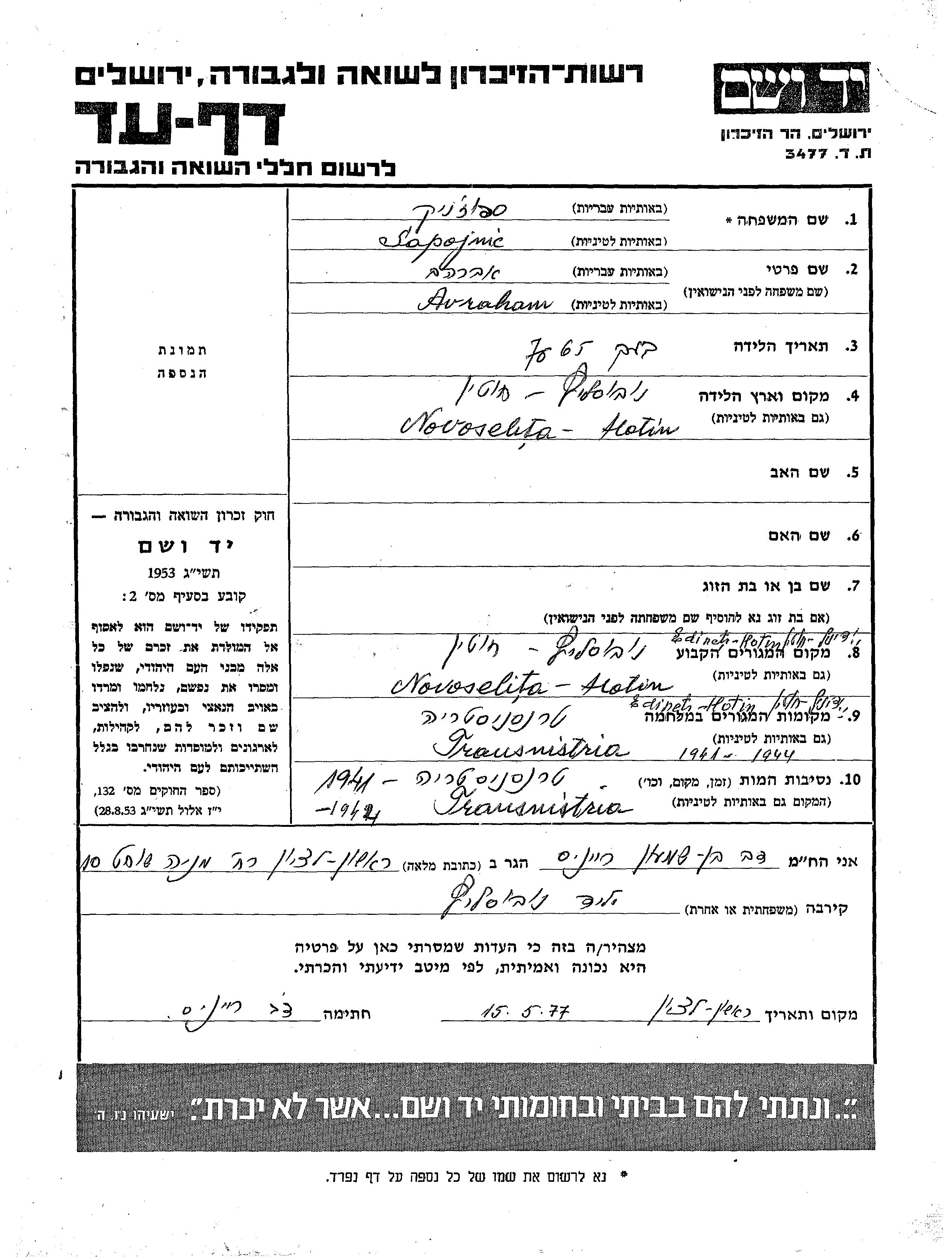 Sapojnic Avraham Novoselita, Roumanie Feuille de témoignage