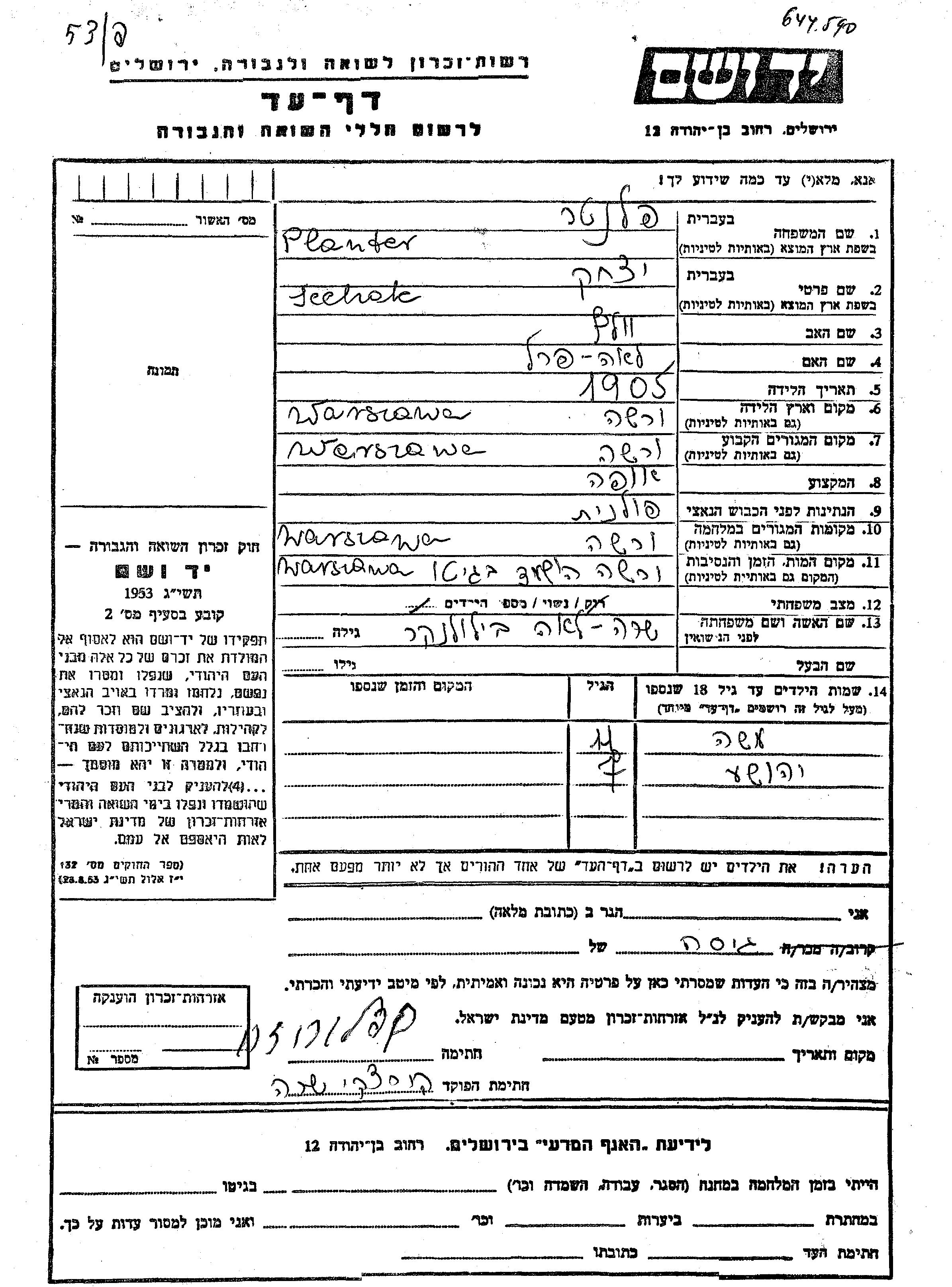 Planter Moshe Warszawa, Pologne Feuille de témoignage