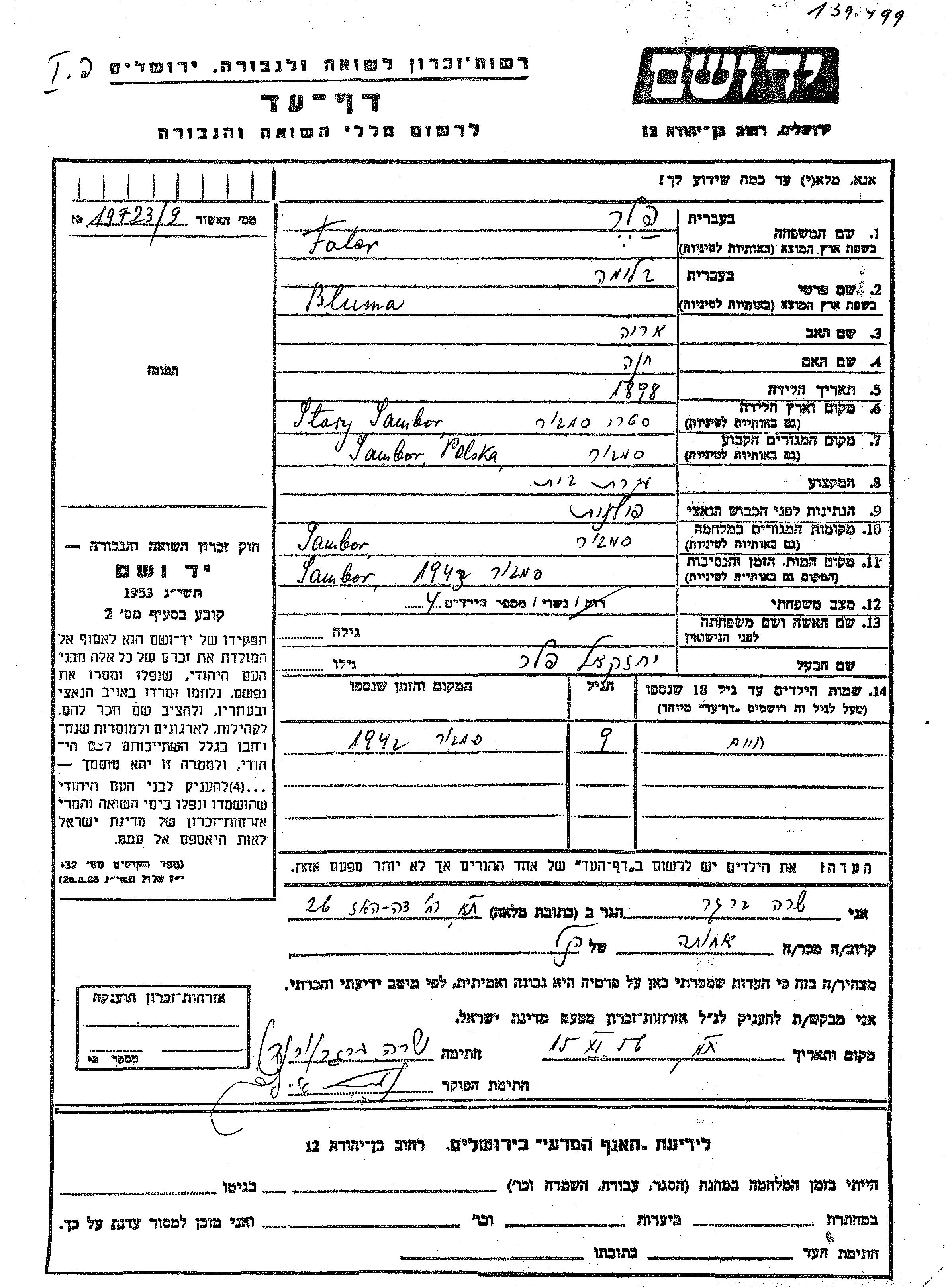 Khaim Faler Feler est né fils de Yekhezkel et de Bluma. Il était Enfant. Avant la seconde guerre mondiale il vivait à Sambor, Pologne. Au cours de la guerre, il était à Sambor, Pologne.