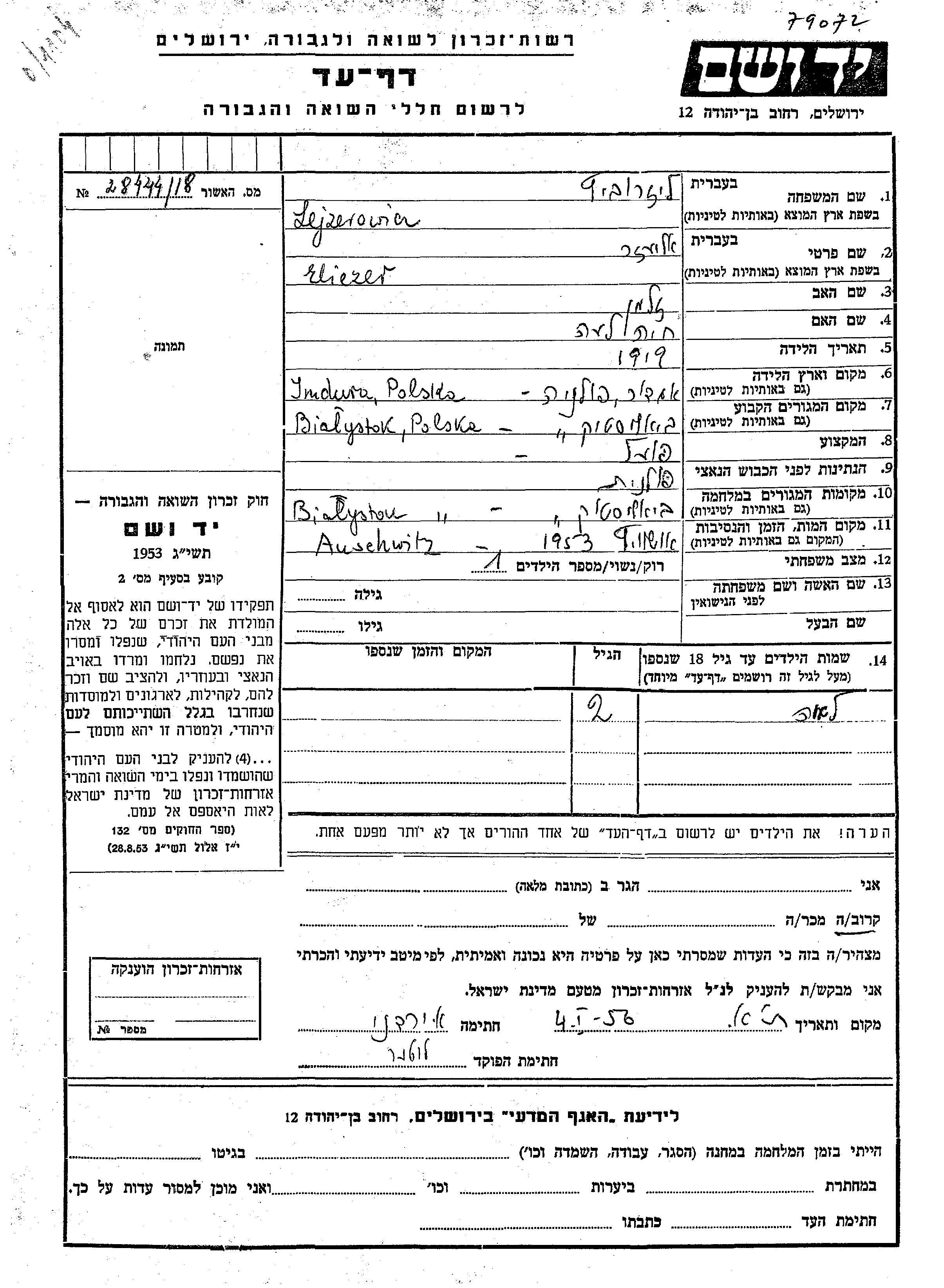 Lejzerowicz Lea Bialystok, Pologne Feuille de témoignage