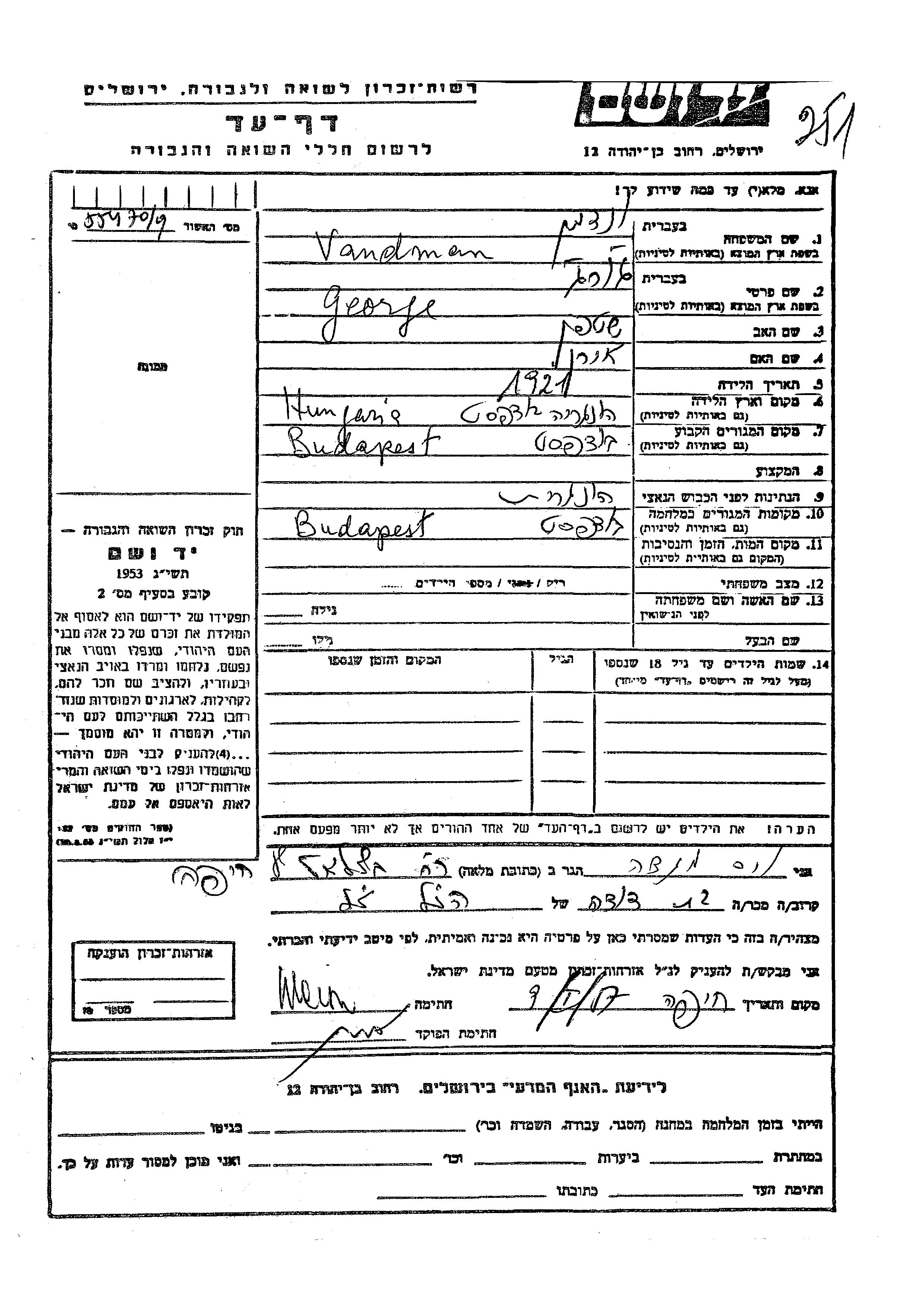 Vandman George 1921 Budapest, Hongrie Feuille de témoignage