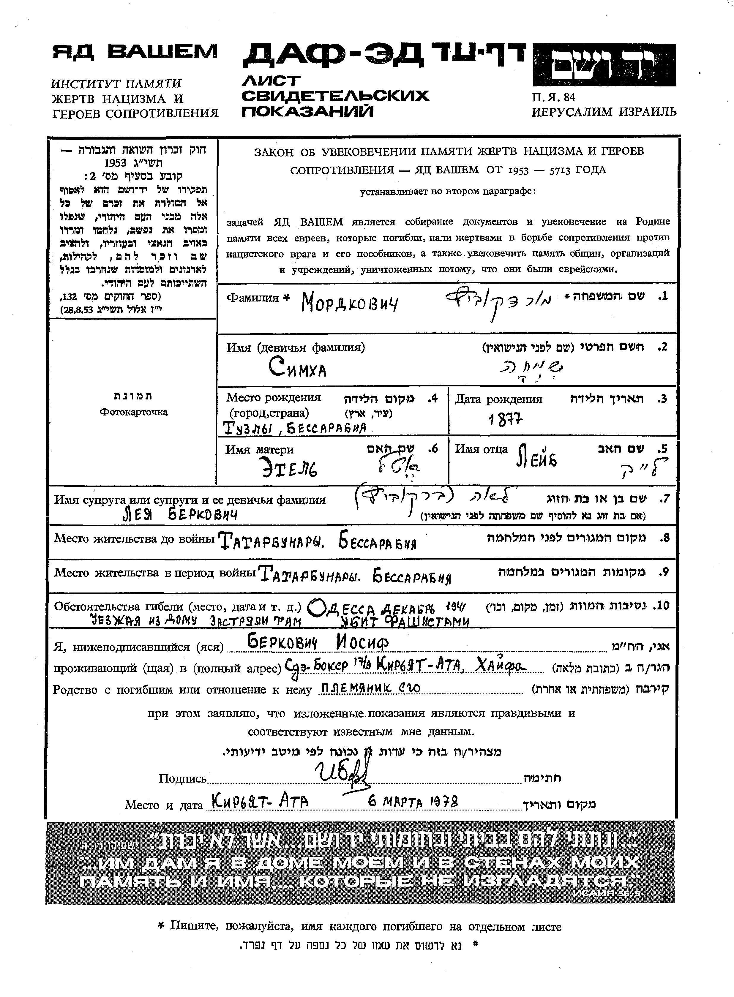 Simkha Mordkovich est né à Tuzly, Roumanie en 1877, fils de Leib et de Etel. Il était Mariée à Leya née Berkovich. Avant la seconde guerre mondiale il vivait à Tatabunary, Roumanie. Au cours de la guerre, il était à Tatabunary, Roumanie.
