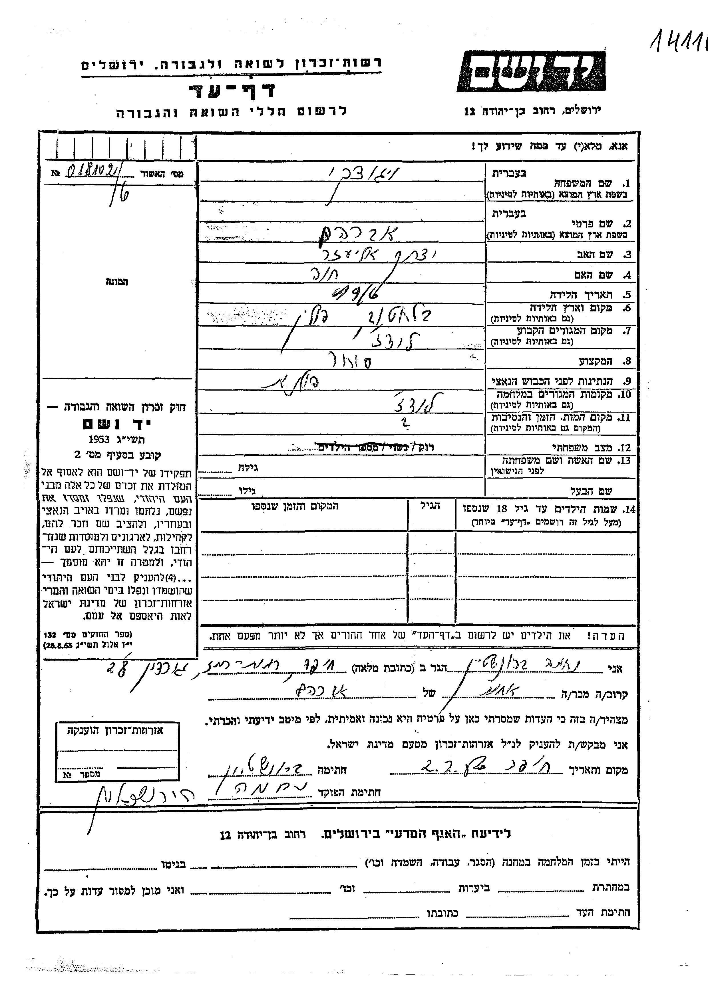 Vigotzki Avraham 1916 Lodz, Pologne Feuille de témoignage