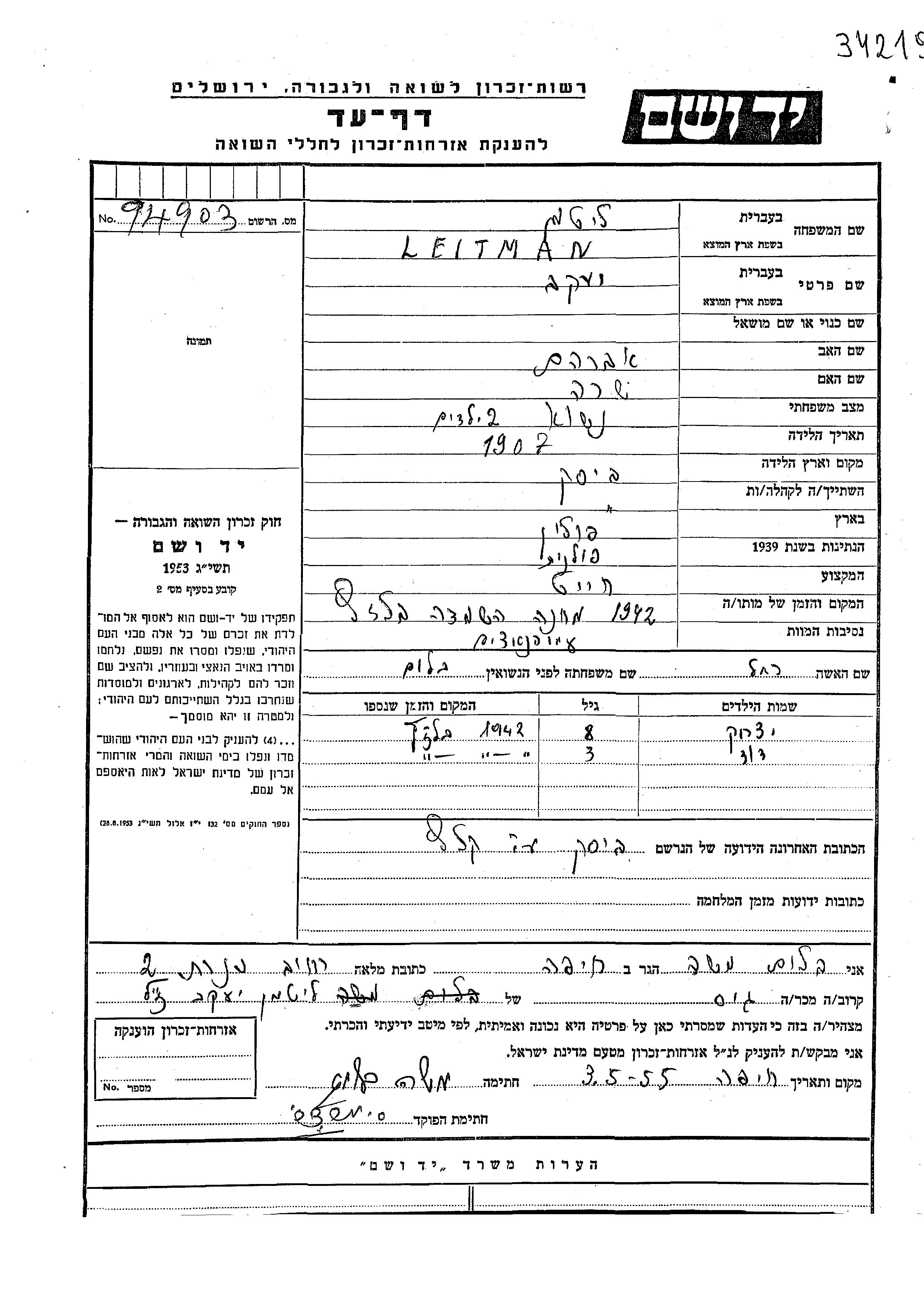 Leitman Litman Yitzkhak Bisk, Pologne Feuille de témoignage