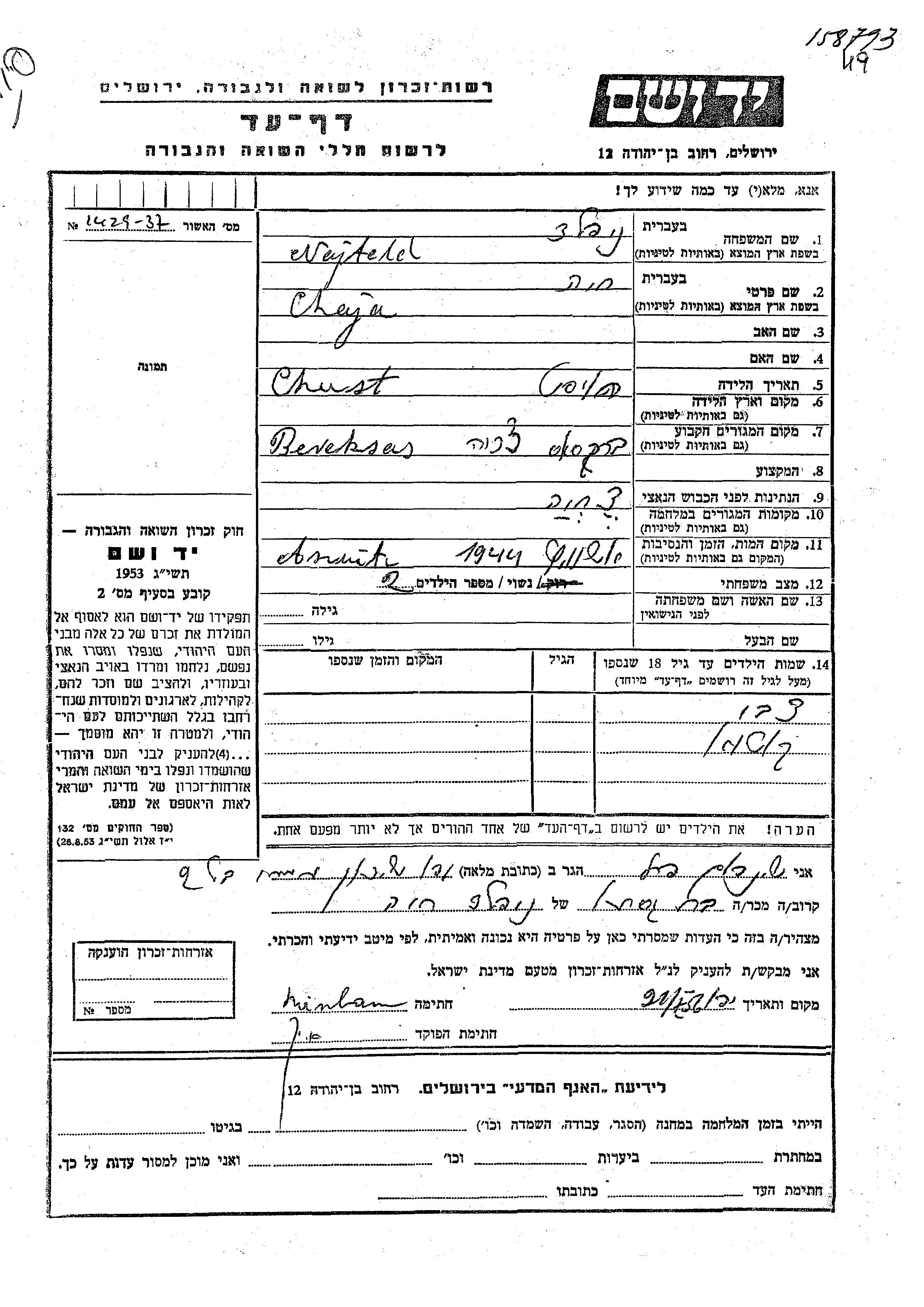 Nejfeld Tzvi Berekszo, Roumanie Feuille de témoignage