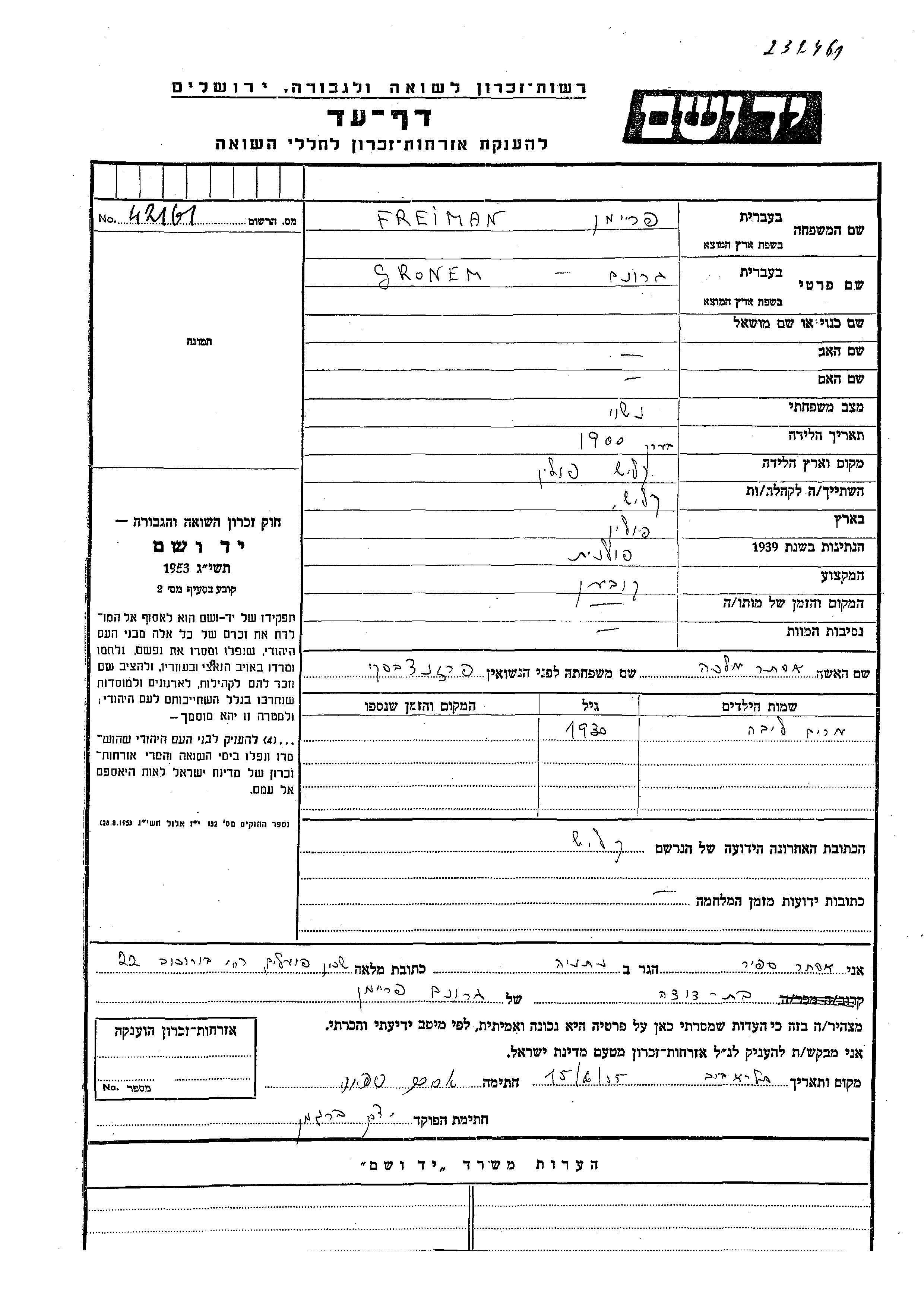 Freiman Miriam Liba 1930 Kalisz, Pologne Feuille de témoignage