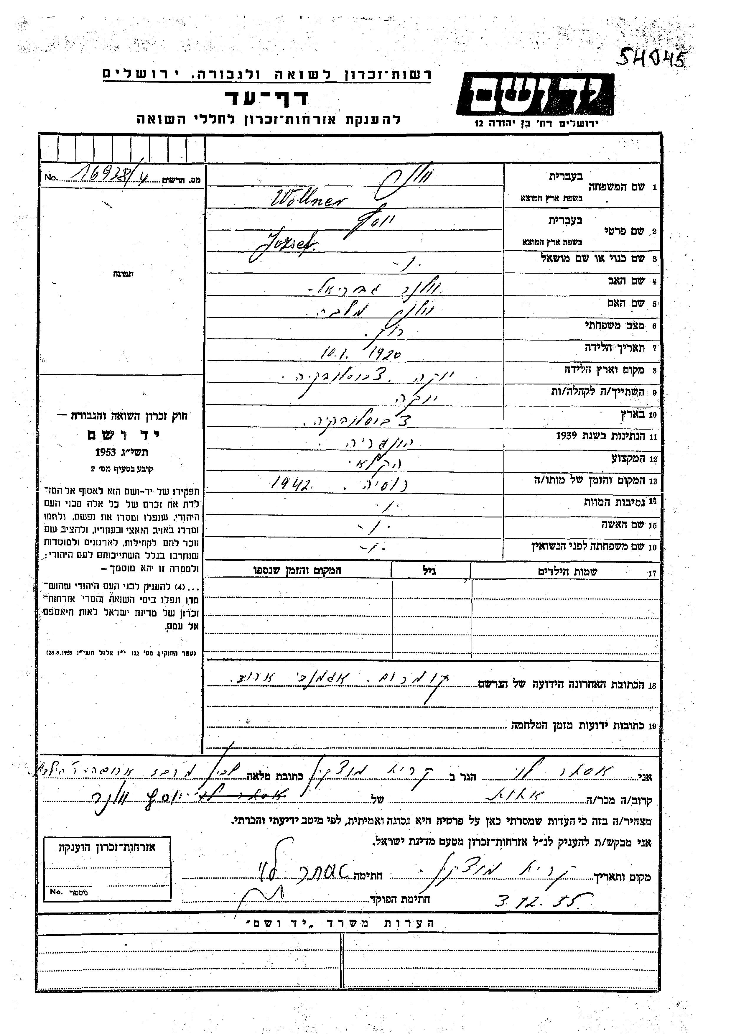 Wollner Joszef 1920 endroit inconnu, Feuille de témoignage