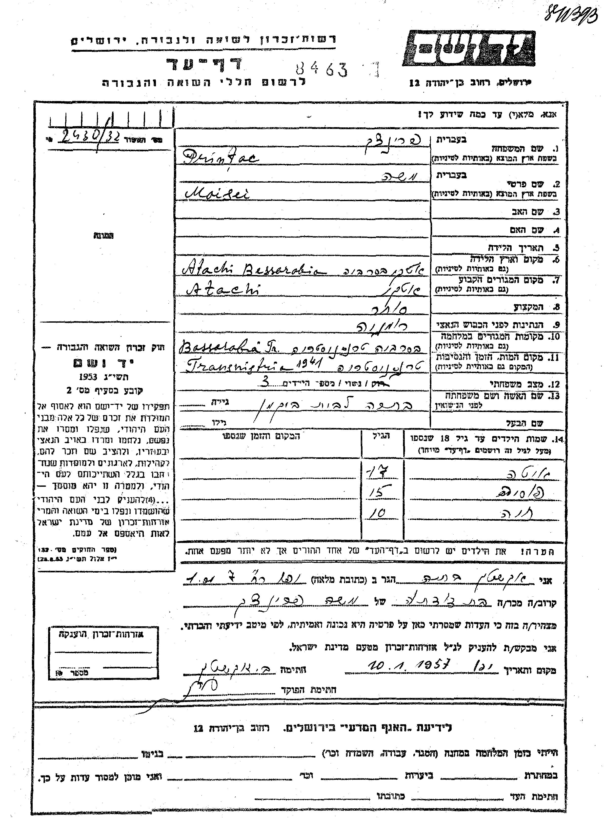 Yad Vashem - Pages of Testimony Names Memorial Collection
