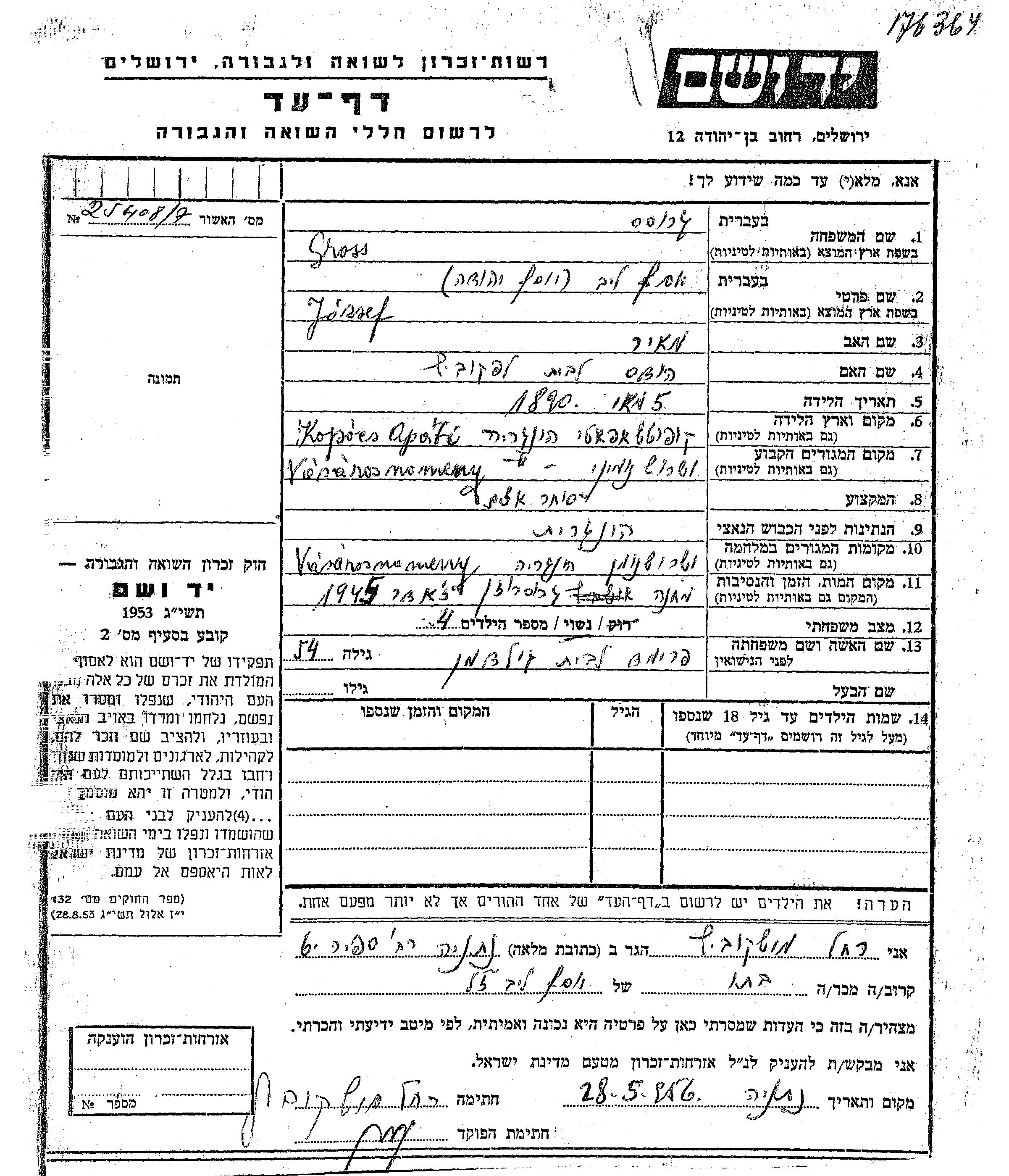Gross Jozsef Leib Yehuda 1890 Vasarosnameny, Hongrie Feuille de témoignage
