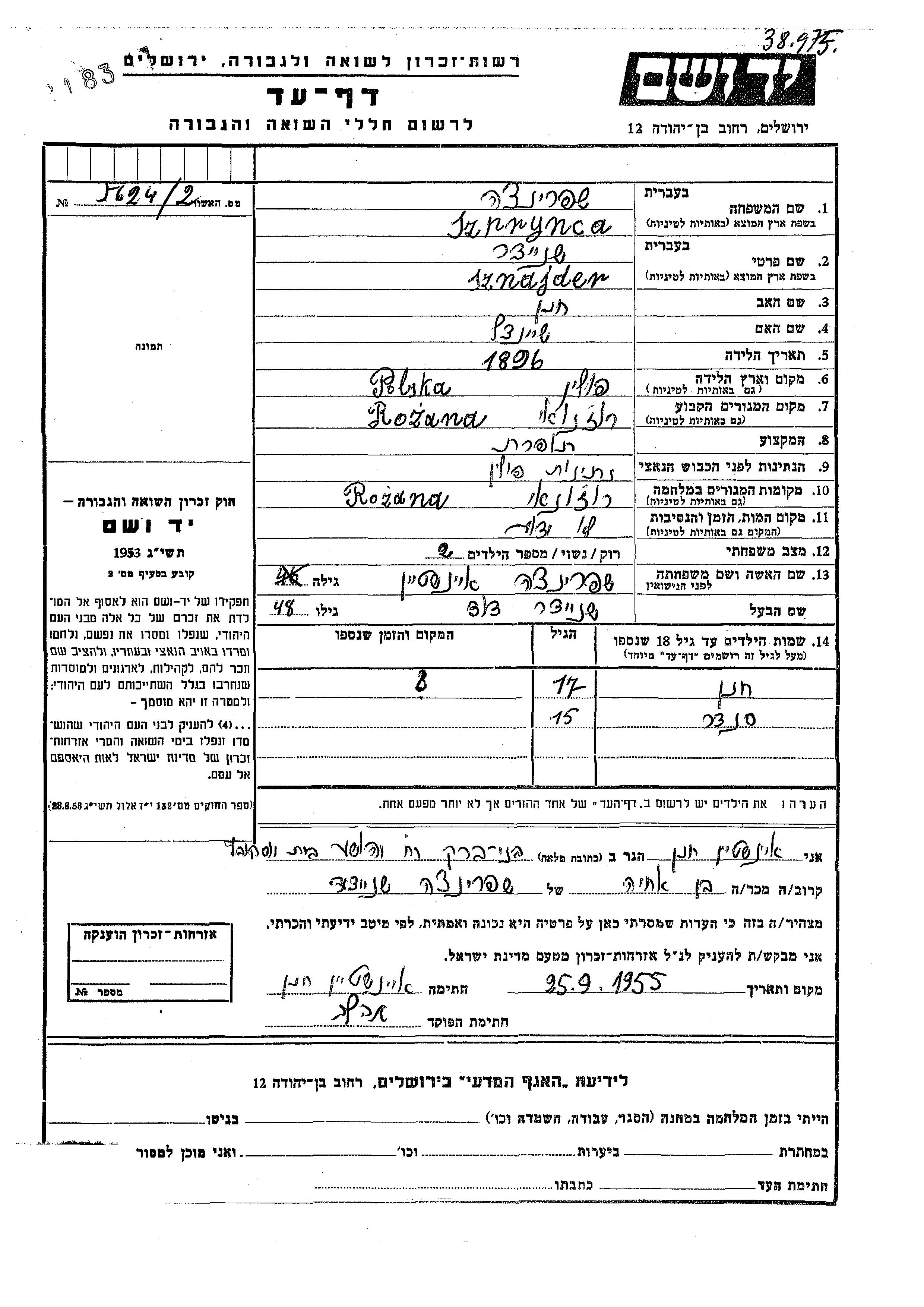 Sznajder Sender Rozana, Pologne Feuille de témoignage