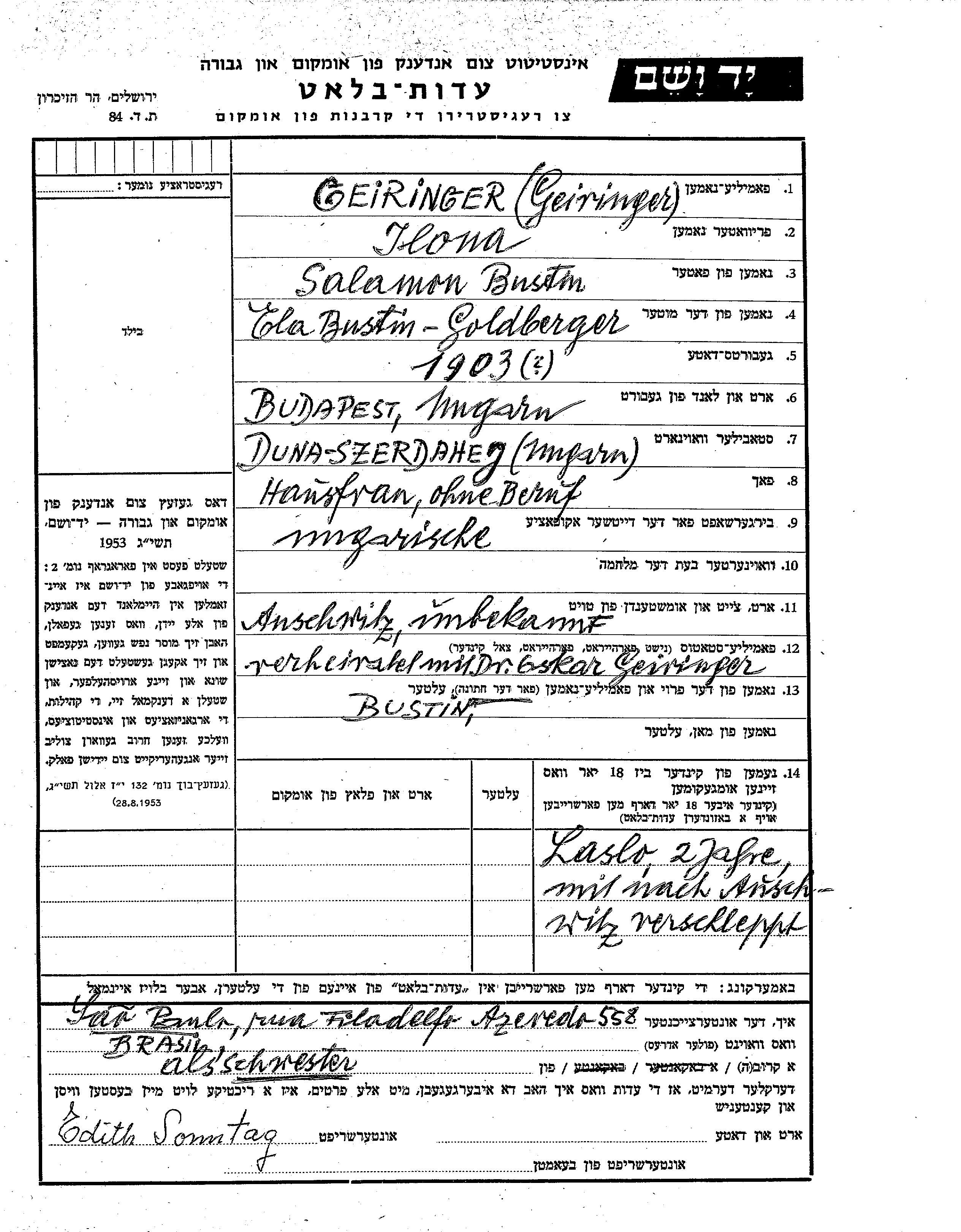 Geiringer Laslo Duna Serdhei, Tchécoslovaquie Feuille de témoignage