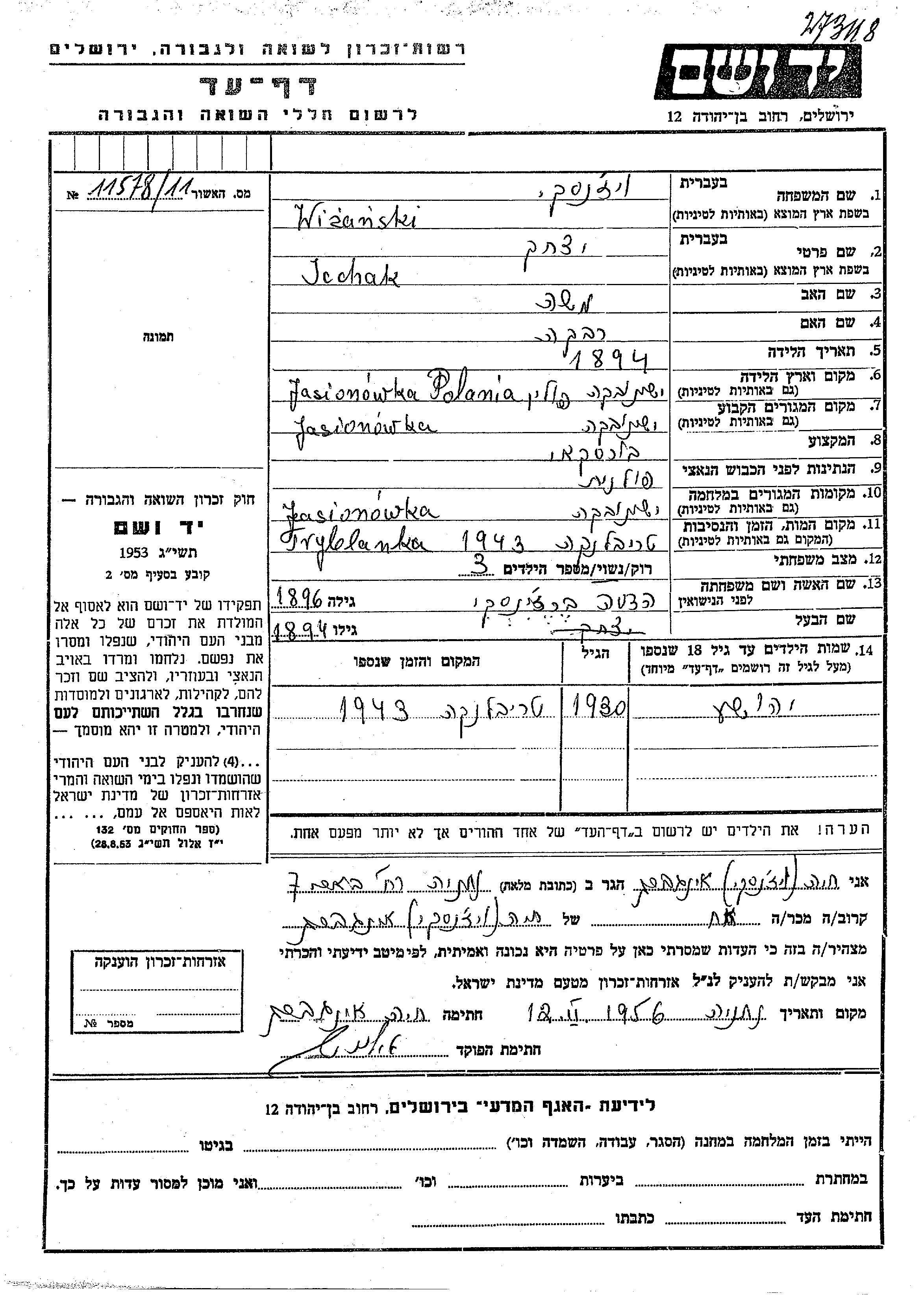 Wizanski Yehoshua 1930 Jasionowka, Pologne Feuille de témoignage