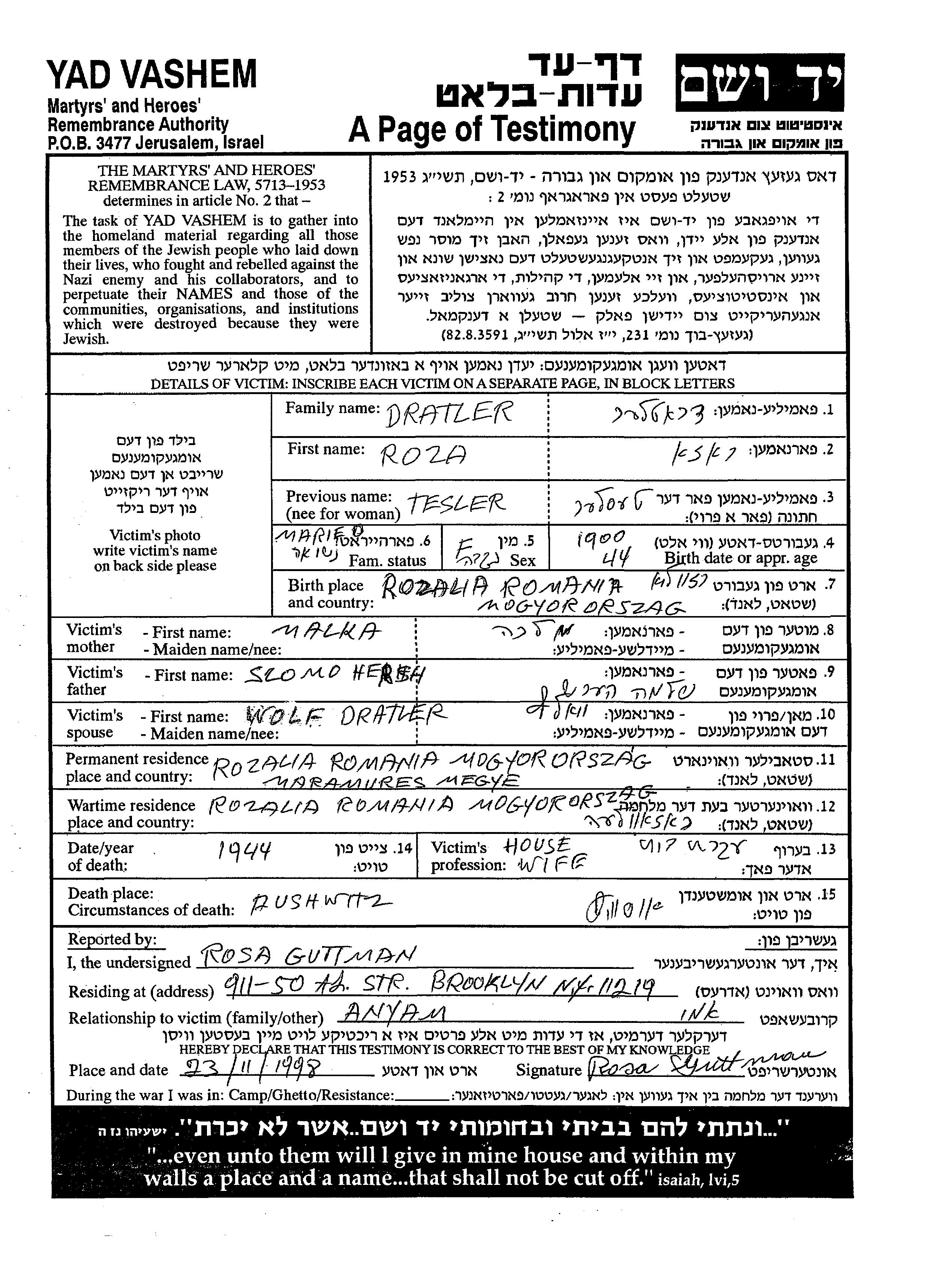 Drattler Roza 1900 endroit inconnu, Feuille de témoignage