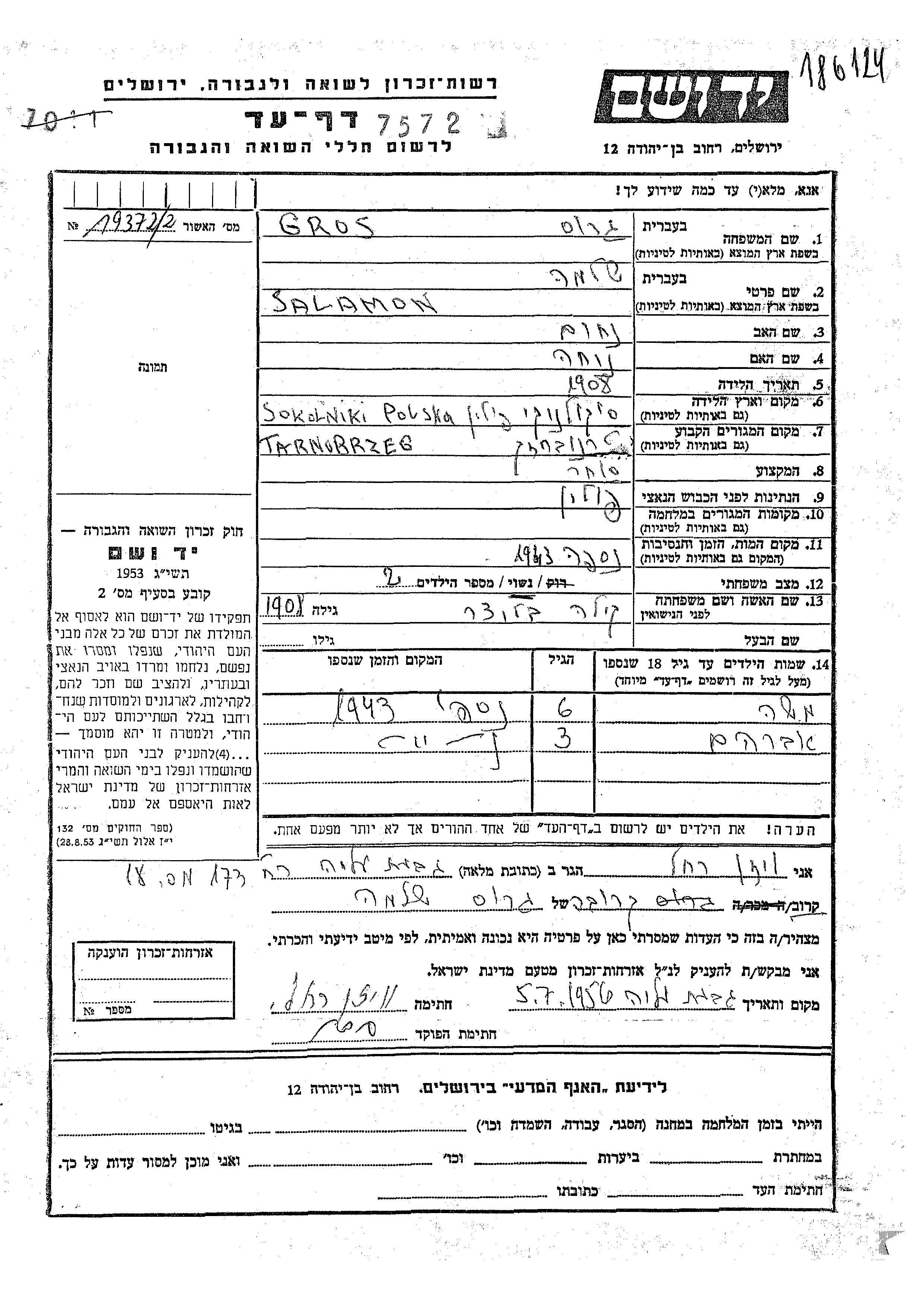 Moshe Gros est né fils de Salamon et de Keila née Blitzer. Il était Enfant. Avant la seconde guerre mondiale il vivait à Tarnobrzeg, Pologne.