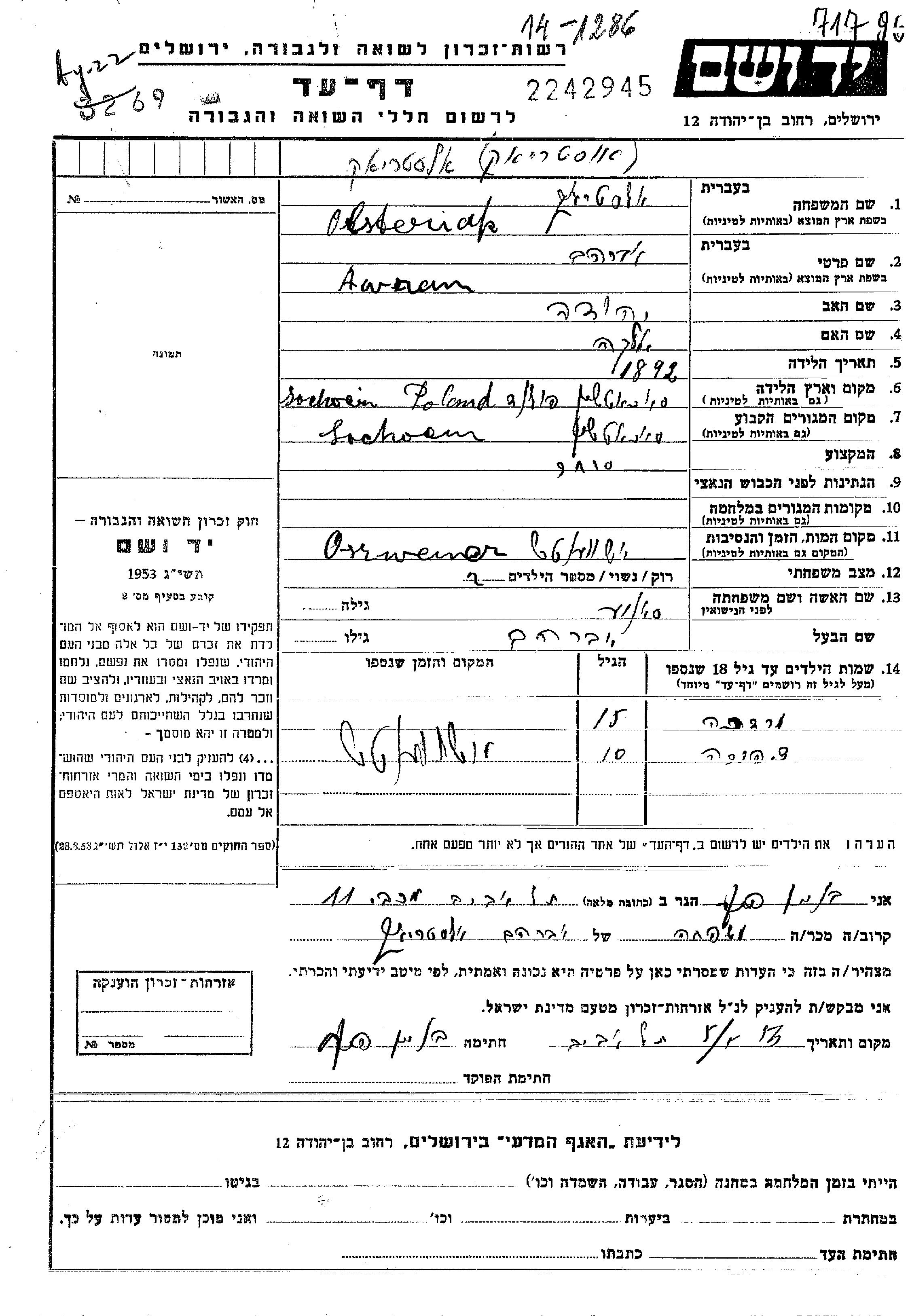 Alstriak Tzipora Sochocin, Pologne Feuille de témoignage