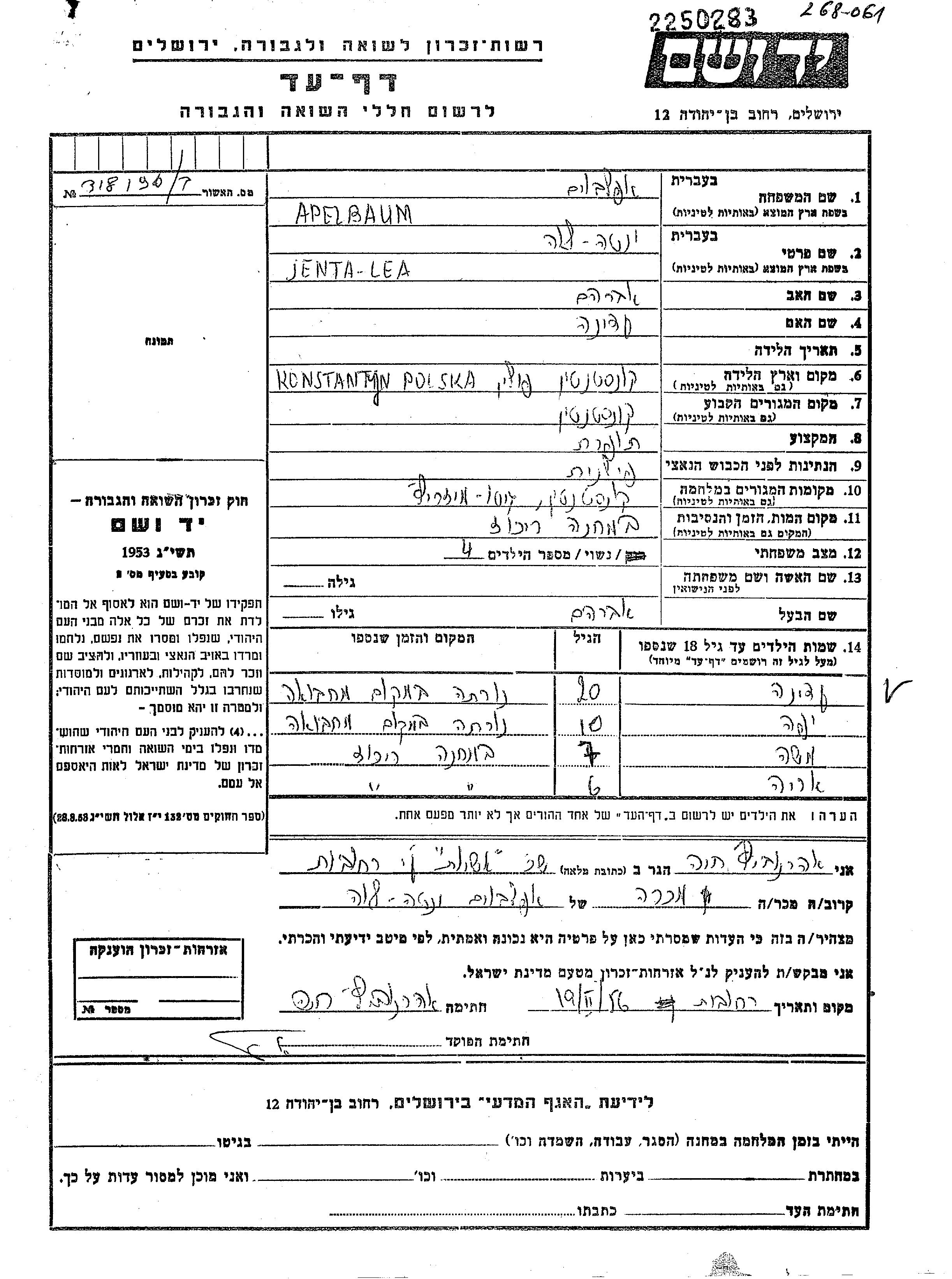 Apelbaum Yafa Konstantyn, Pologne Feuille de témoignage