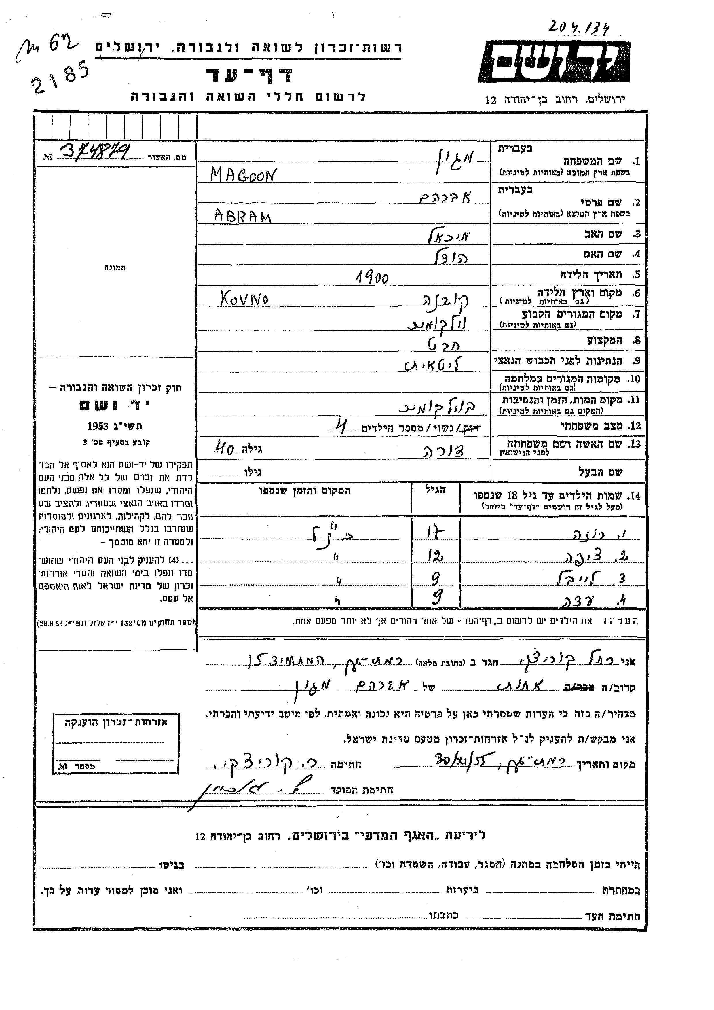 Magoon Ada Wilkomir, Lituanie Feuille de témoignage