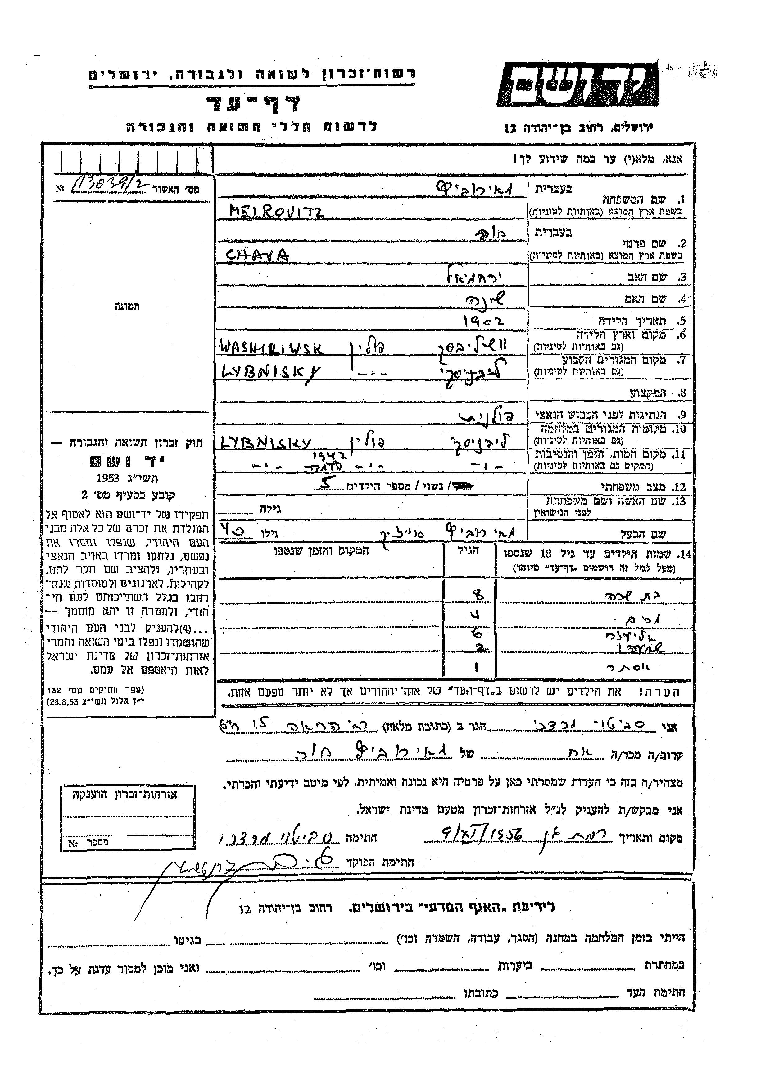 Meirovitz Ester Lipniszki, Pologne Feuille de témoignage