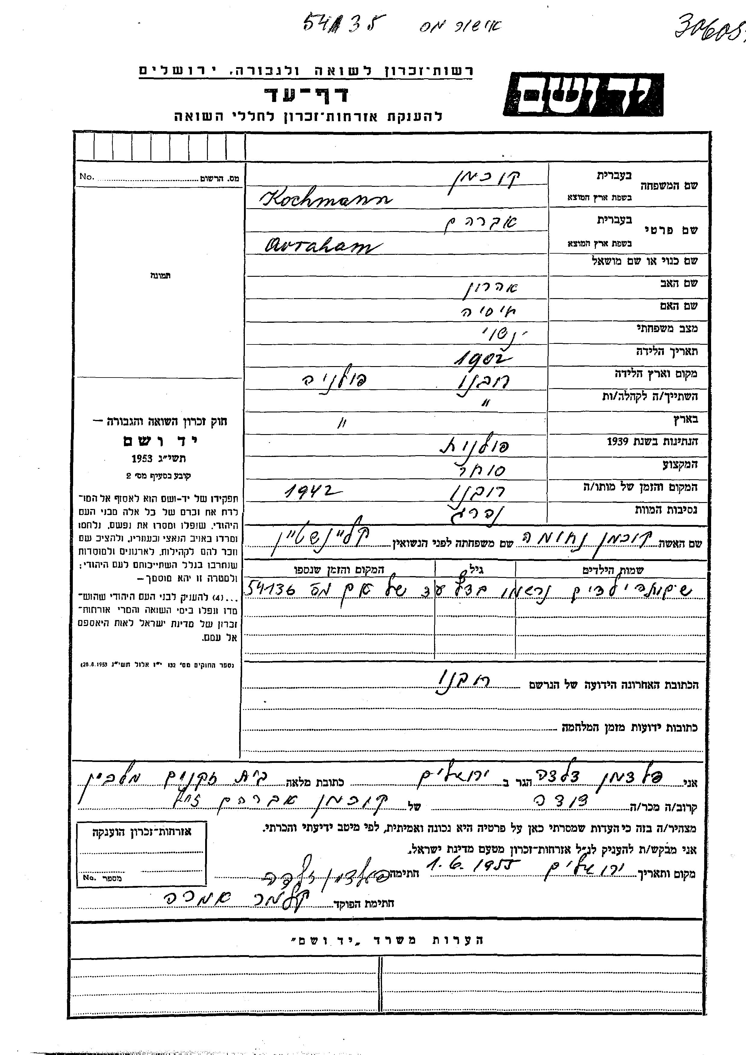 Kochmann Avraham 1902 endroit inconnu, Feuille de témoignage