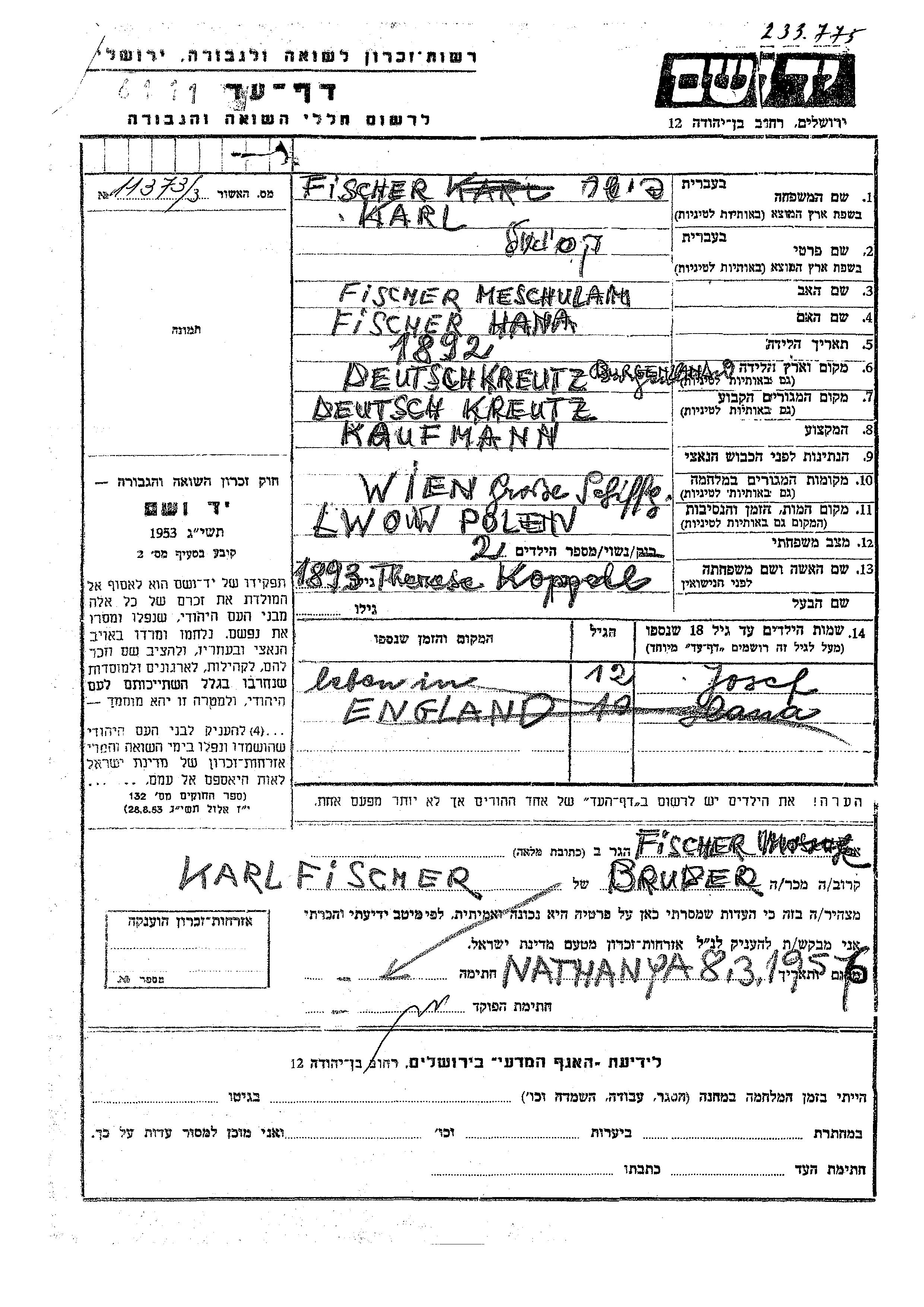 Josef Fischer est né fils de Karl Yekutiel et de Therese née Koppel. Il était Enfant. Avant la seconde guerre mondiale il vivait à Deutschkreuz, Autriche. Au cours de la guerre, il était à Wien, Autriche.