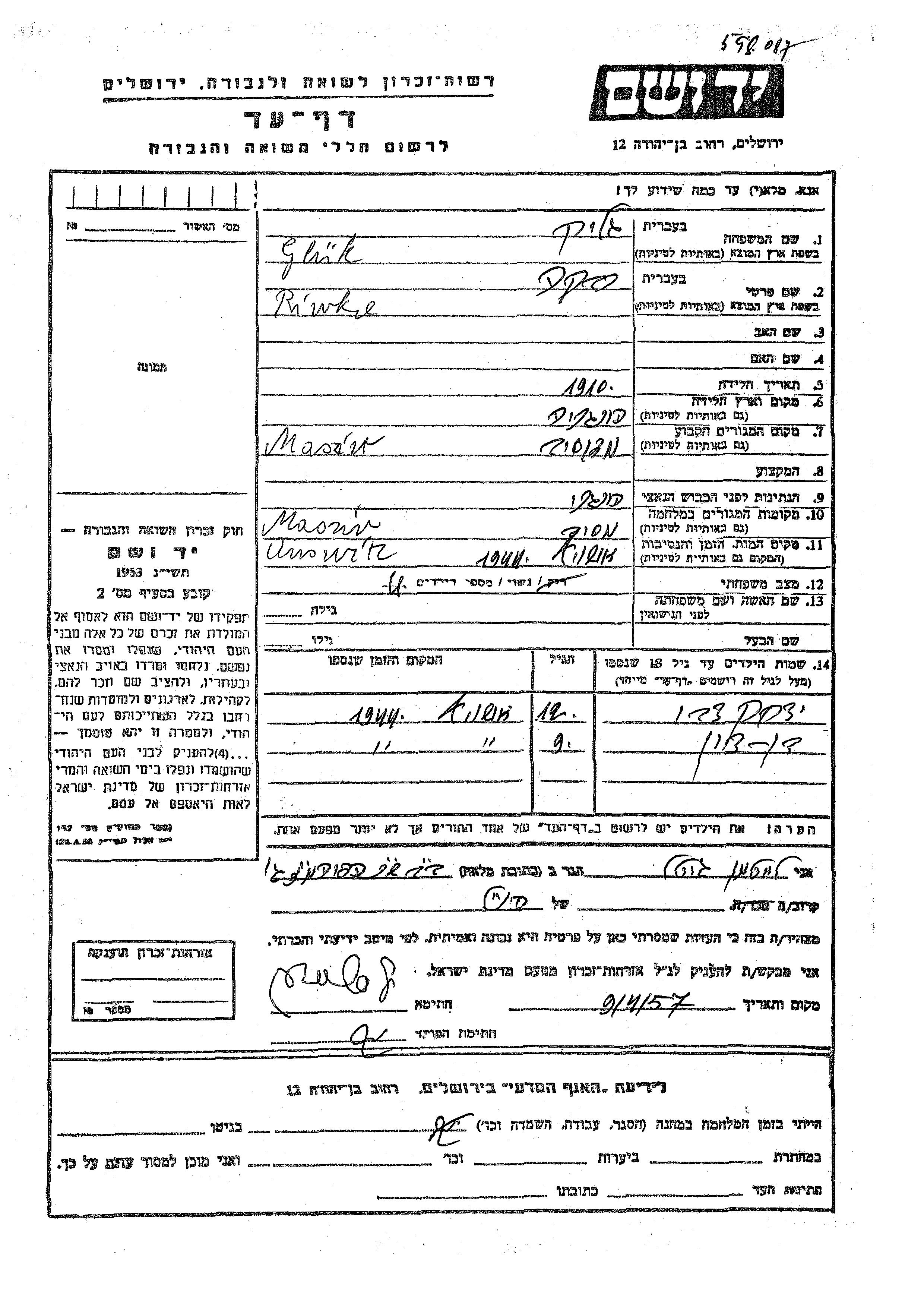 Bentzion Gluek est né fils de Riwka. Il était Enfant. Avant la seconde guerre mondiale il vivait à Masiv, Roumanie. Au cours de la guerre, il était à Masiv, Roumanie.