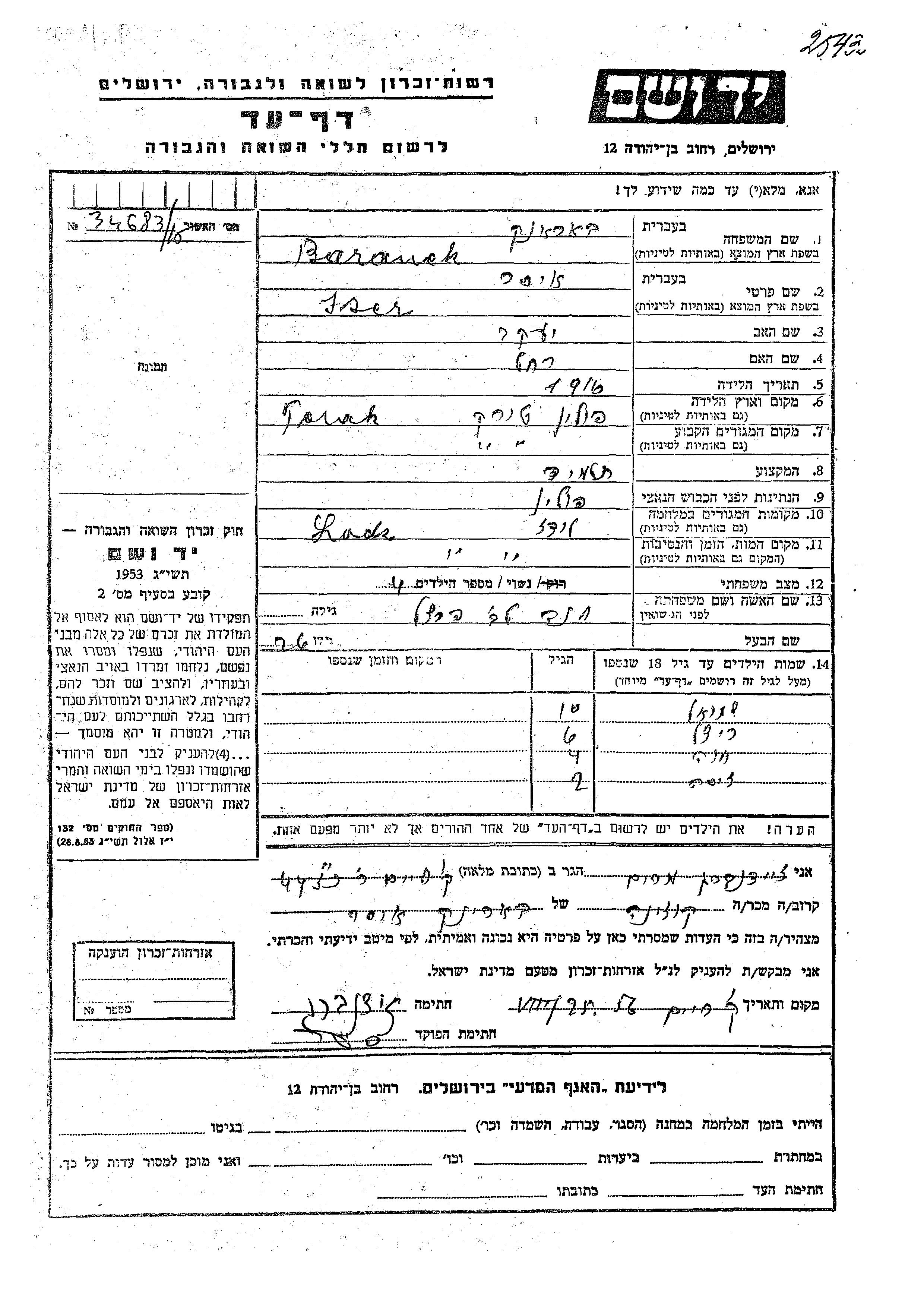 Dina Baranek est née fille de Isser et de Khana née Hertzel. Elle était Enfant. Avant la seconde guerre mondiale elle vivait à Torak, Pologne. Pendant la guerre, elle était à Lodz, Pologne.