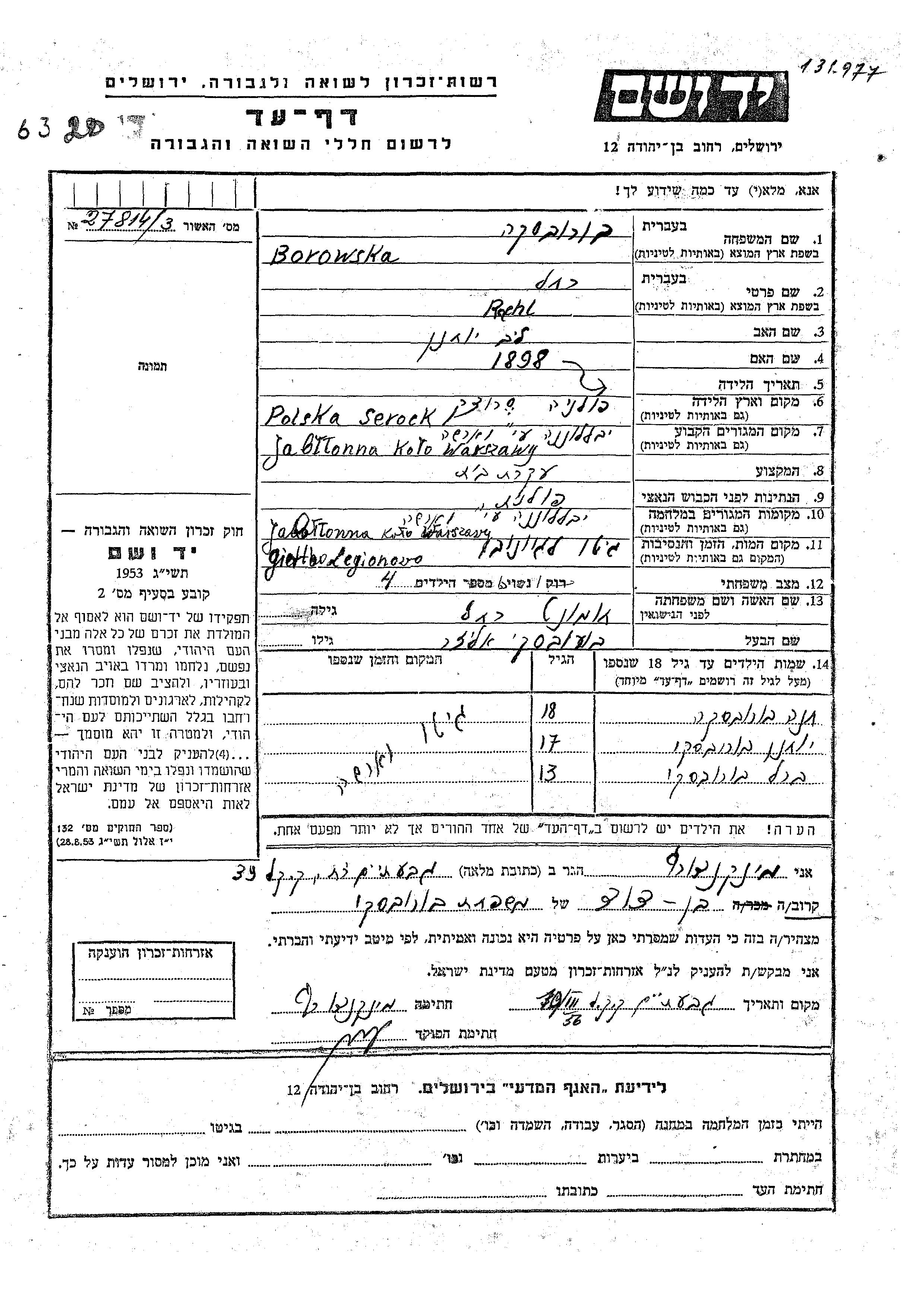Berl Borowska est né fils de Eliezer et de Rachl née Khomont. Il était Enfant. Avant la seconde guerre mondiale il vivait à Jablonna, Pologne. Au cours de la guerre, il était à Jablonna, Pologne.