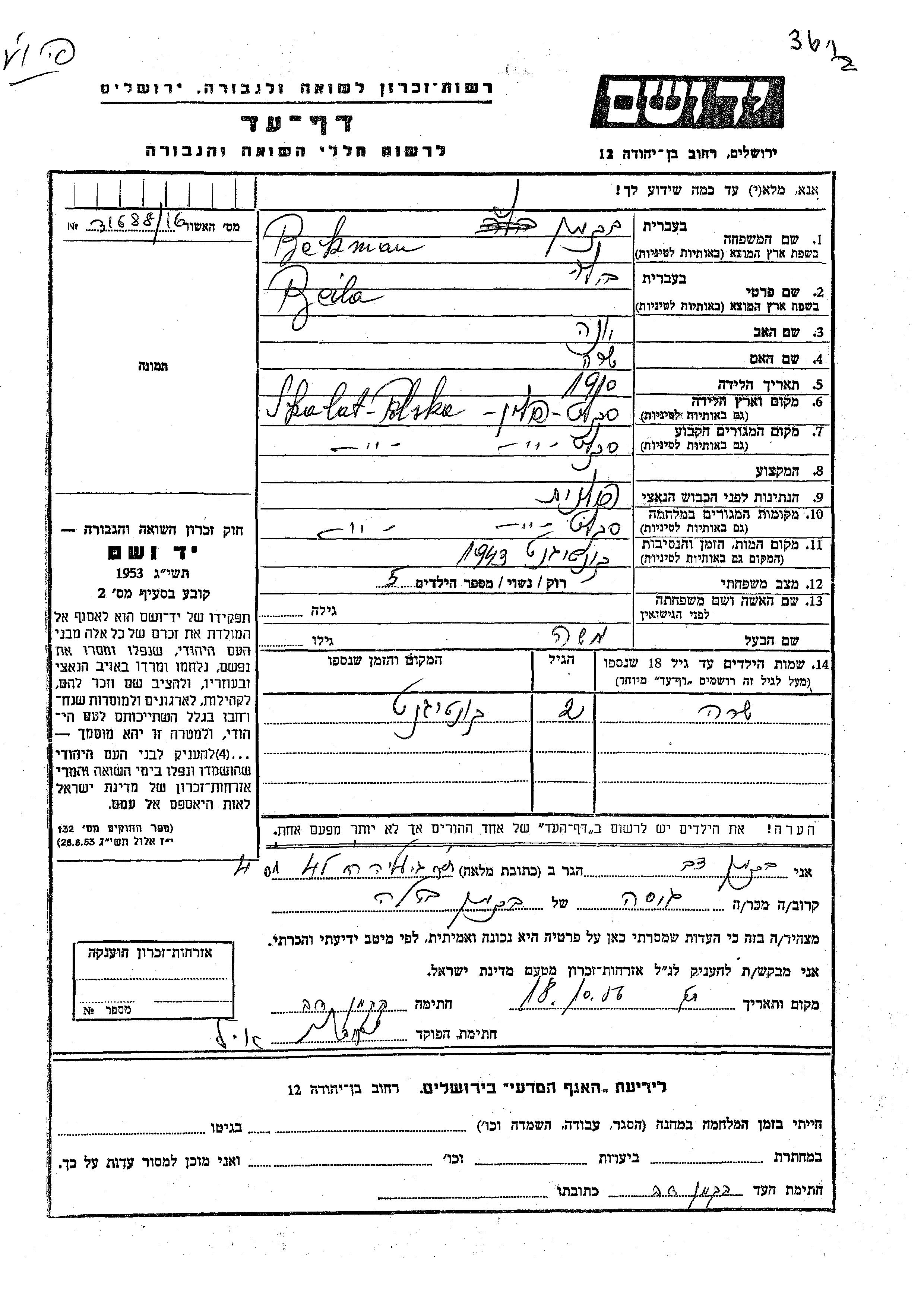 Yad Vashem - Pages of Testimony Names Memorial Collection