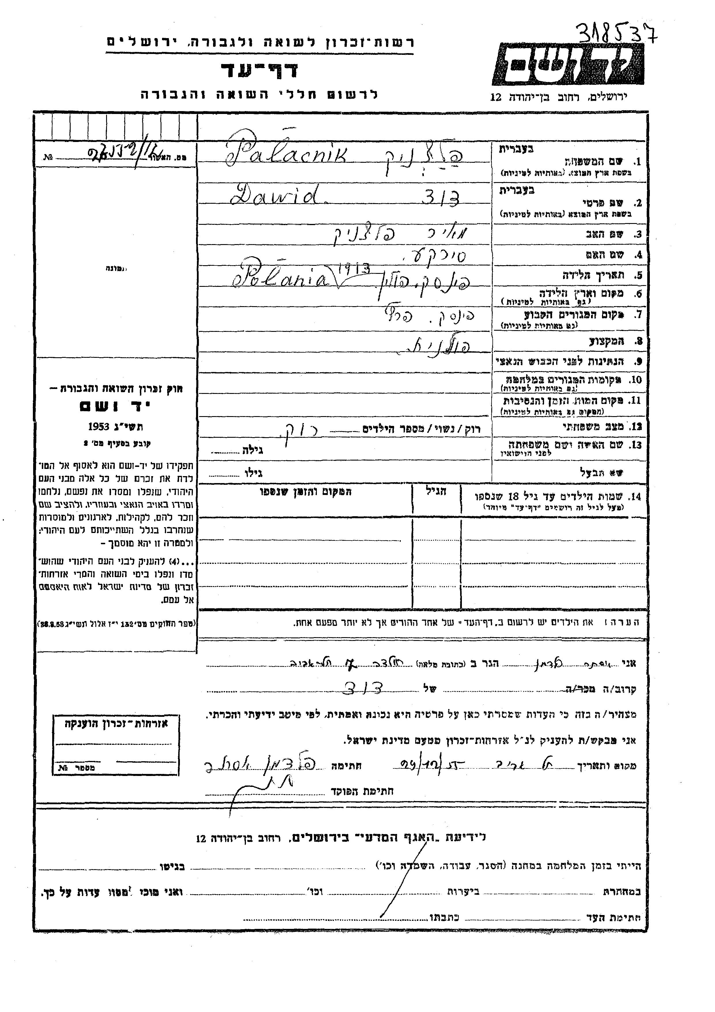 Dawid Palacnik est né à Pinsk, Pologne en 1913, fils de Meir et de Sara. Il était Célibataire. Avant la seconde guerre mondiale il vivait à Pinsk, Pologne.