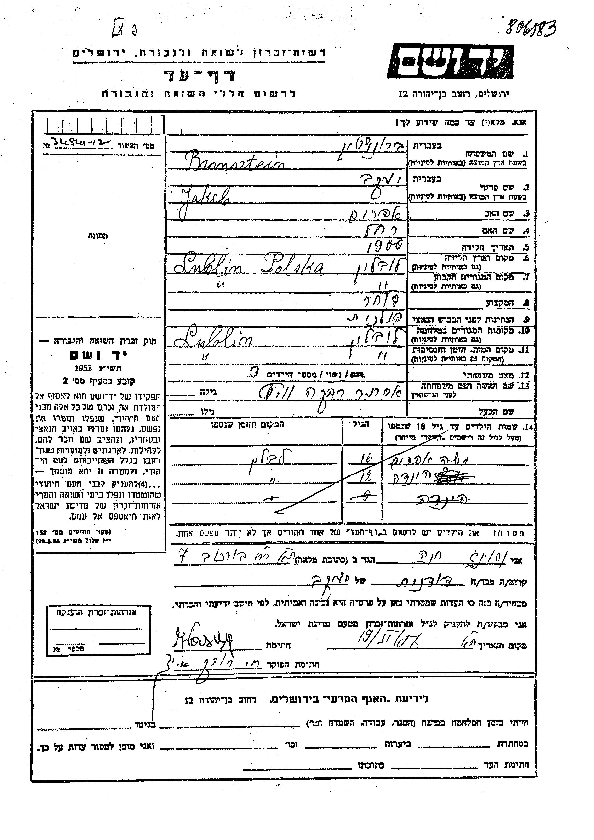 Bronsztein Jakob 1900 Lublin, Pologne Feuille de témoignage
