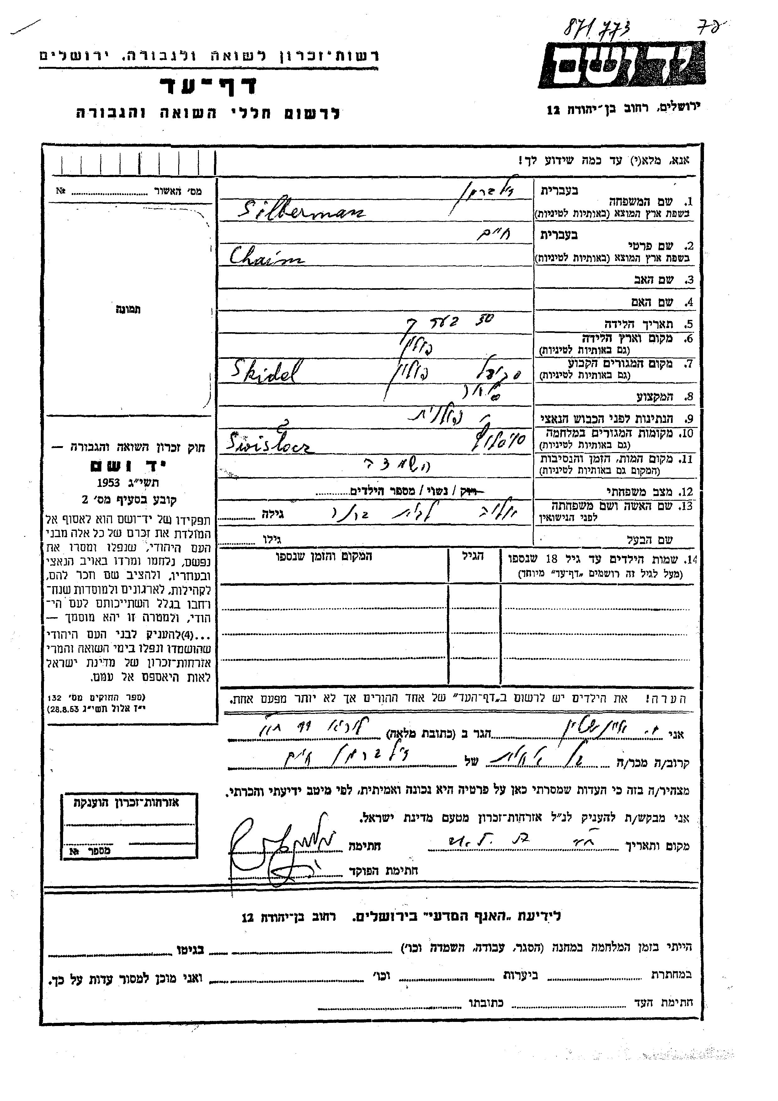 Silberman Chaim Skidal, Pologne Feuille de témoignage