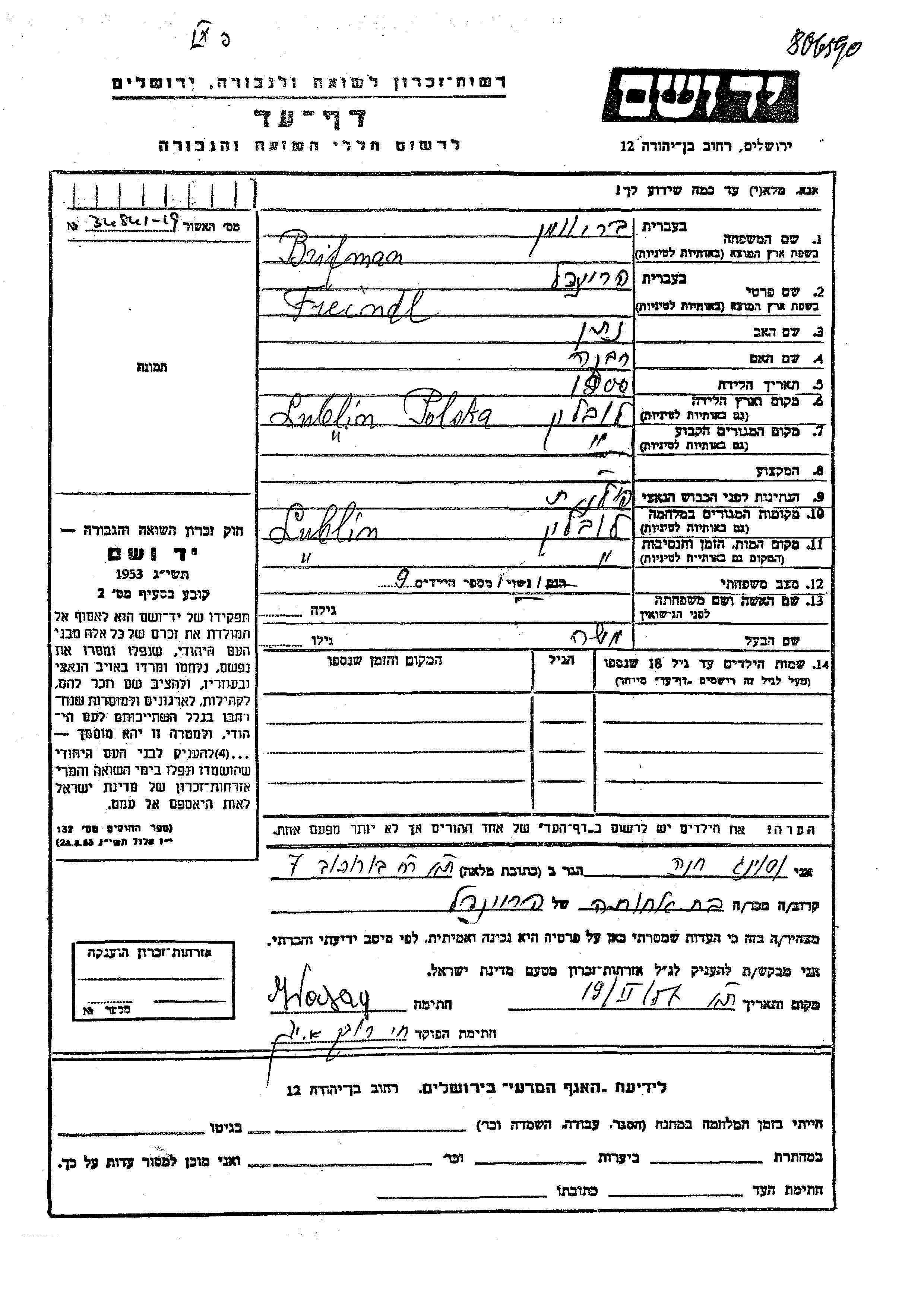 Brifman Freindel 1900 Lublin, Pologne Feuille de témoignage