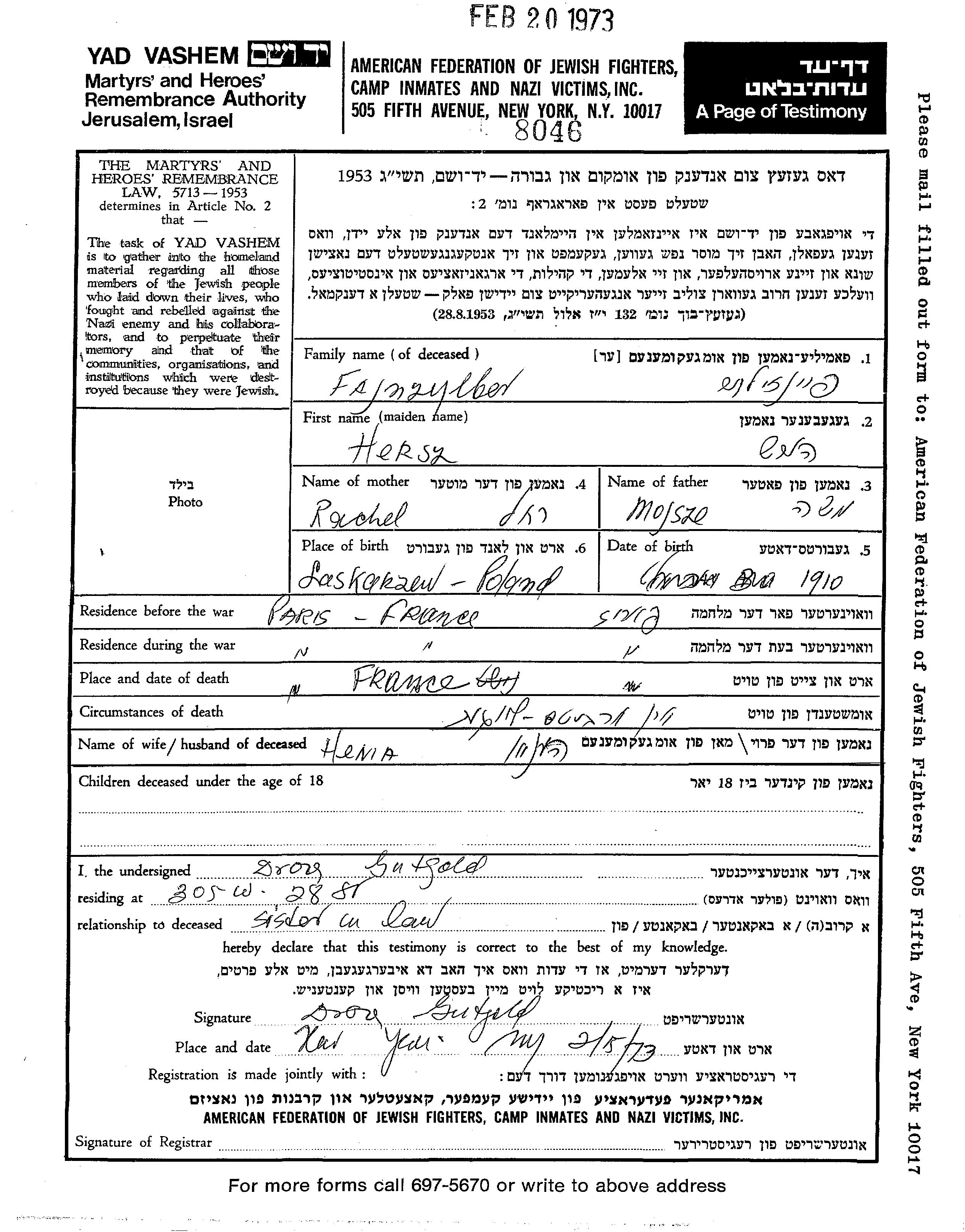 Hersz Fajnzylber est né à Laskarzew, Pologne en 1910, fils de Mojsze et de Rachel. Il était Mariée à Henia. Avant la seconde guerre mondiale il vivait à Paris, France. Au cours de la guerre, il était à Paris, France.