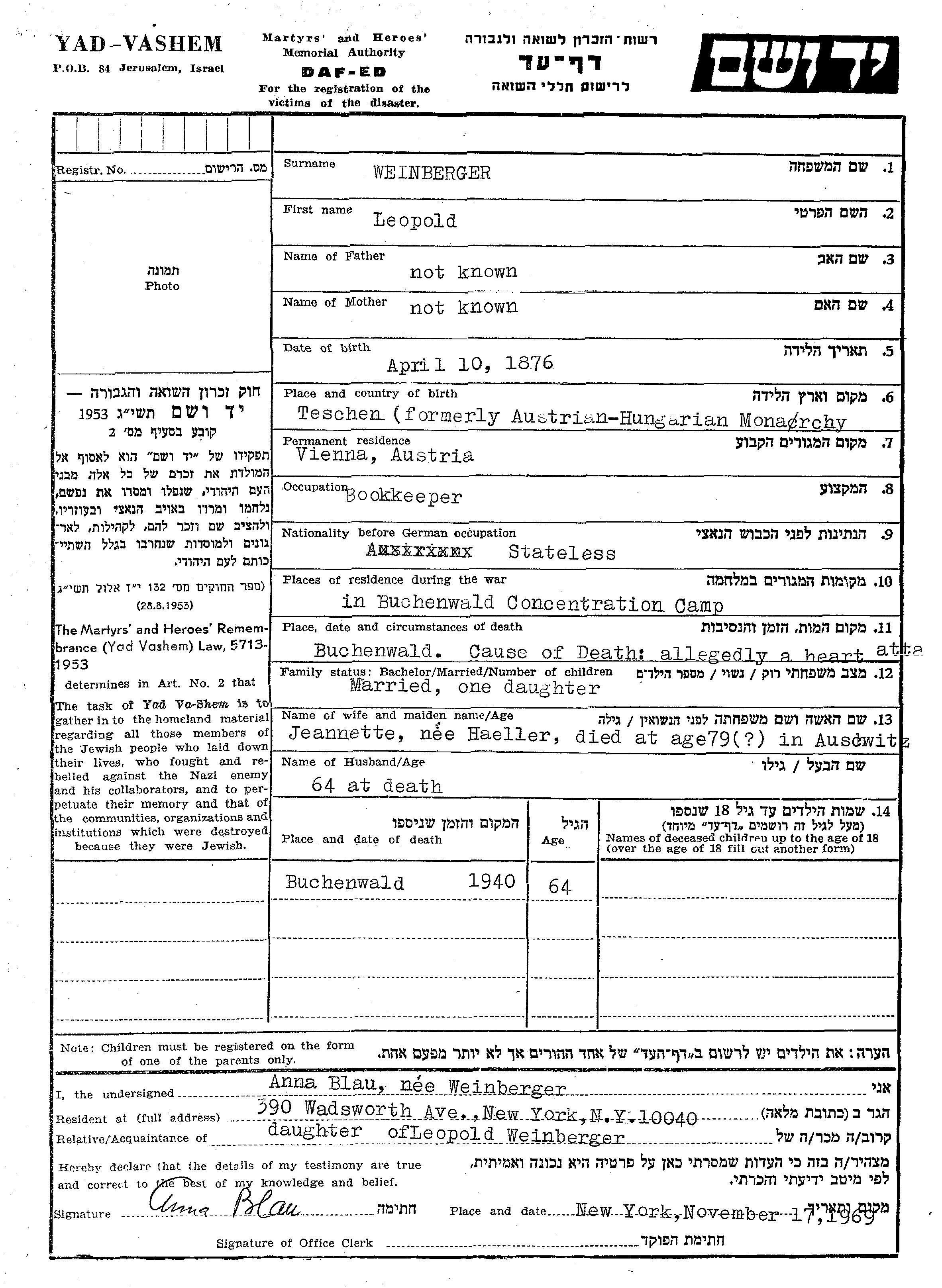 Leopold Weinberger est né à Teschen en 1876. Il était Comptable et Mariée à Jeannette née Haeller. Avant la seconde guerre mondiale il vivait à Vienna, Autriche. Au cours de la guerre, il était à Buchenwald, Allemagne.