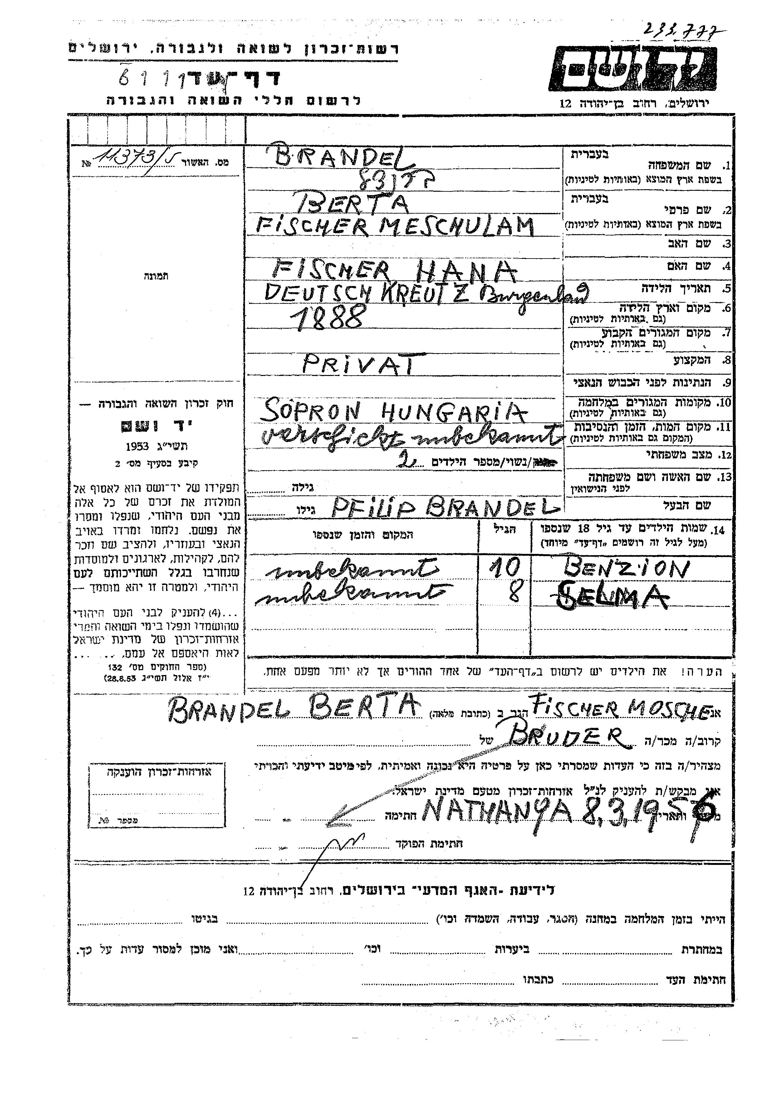 Berta Brandel née Fischer est née à Deutschkreuz, Autriche en 1888, fille de Meschulam et de Hana. Elle était Travailleur indépendent et Mariée à Pfilip. Avant la seconde guerre mondiale elle vivait à Zwickau, Allemagne. Pendant la guerre, elle était à Sopron, Hongrie.