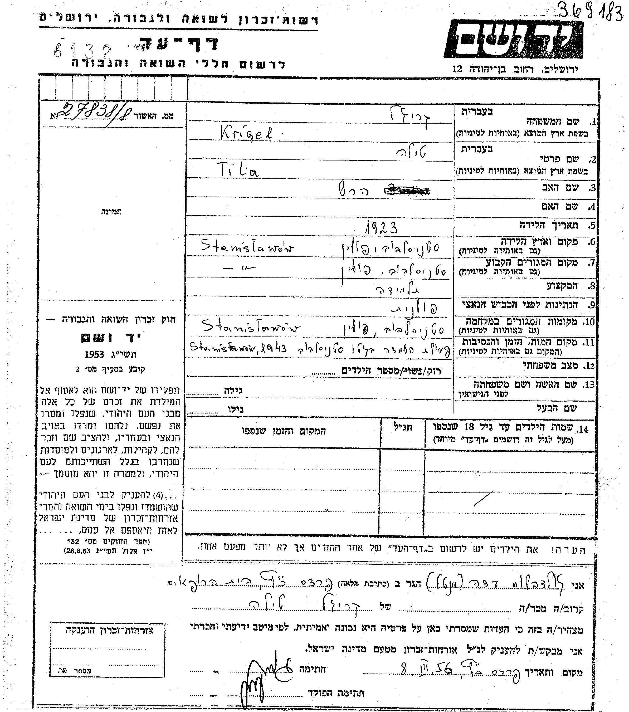Tila Krigel est née à Stanislawow, Pologne en 1923, fille de Hersh. Elle était Élève et Célibataire. Avant la seconde guerre mondiale elle vivait à Stanislawow, Pologne. Pendant la guerre, elle était à Stanislawow, Pologne.
