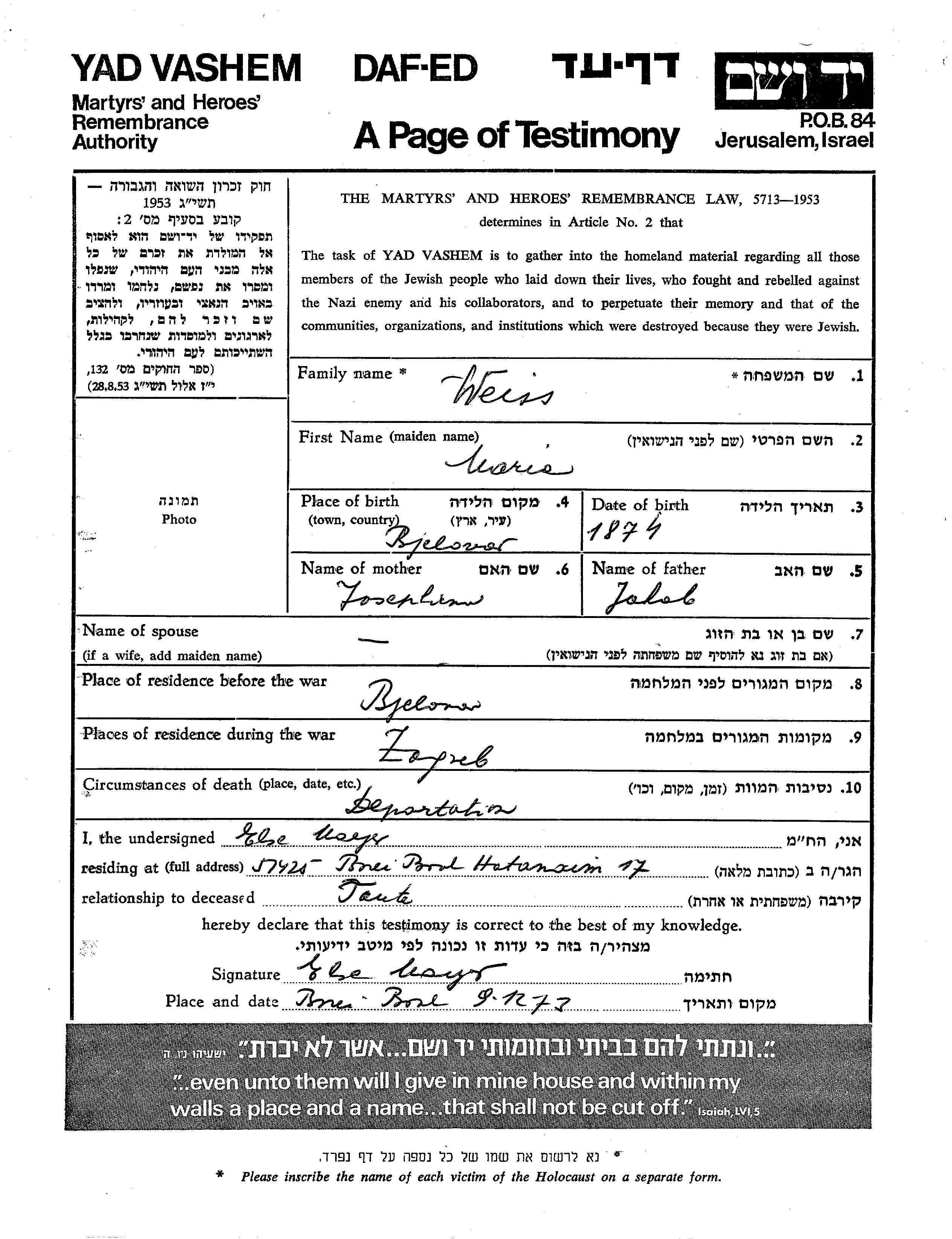 Maria Weiss est née à Bjelovar, Yugoslavie en 1874, fille de Yakob et de Josephina. Avant la seconde guerre mondiale elle vivait à Bjelovar, Yugoslavie.