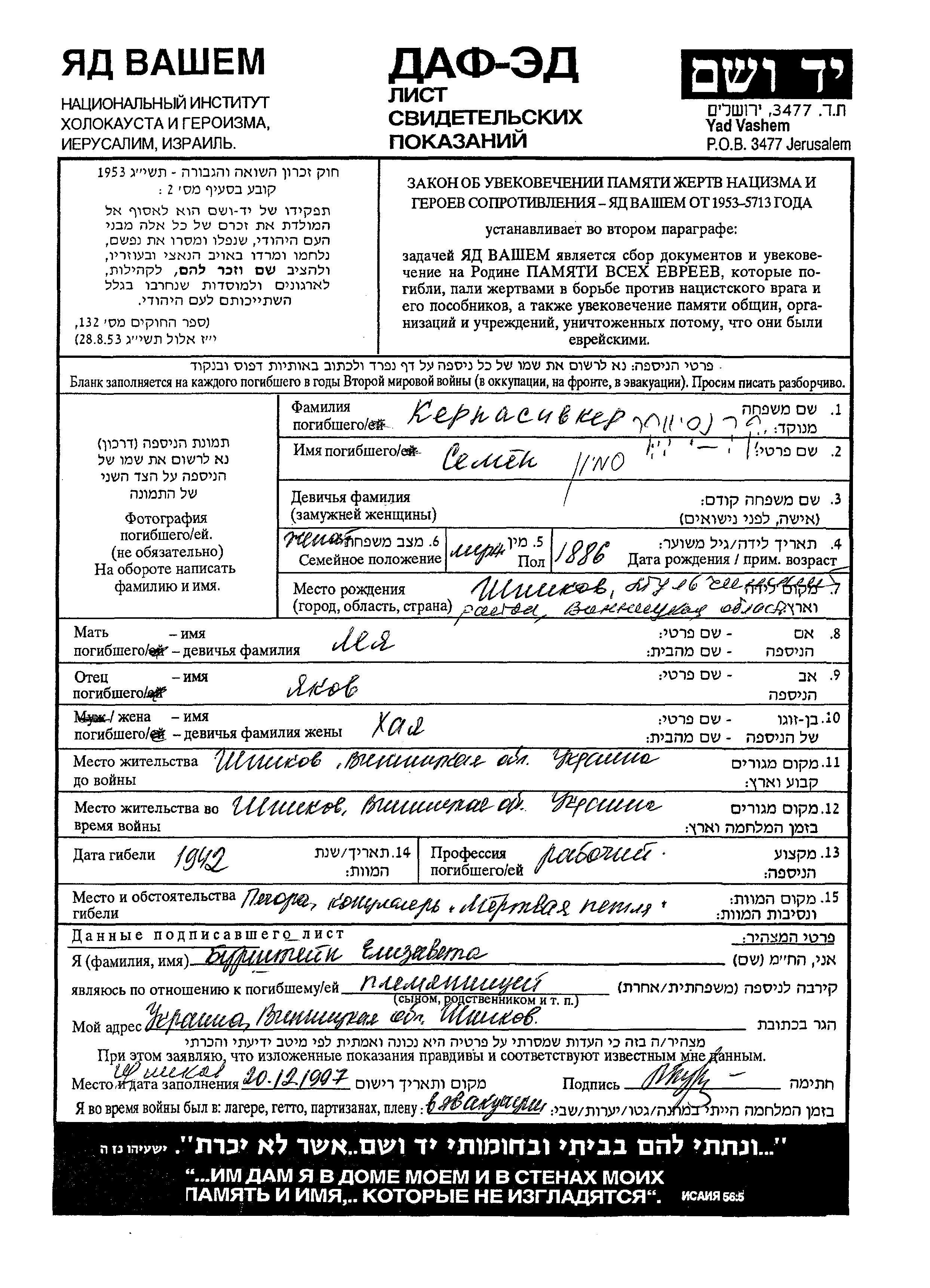 Kernasivker Semyon 1886 Shpikov, Ukraine (URSS) Feuille de témoignage